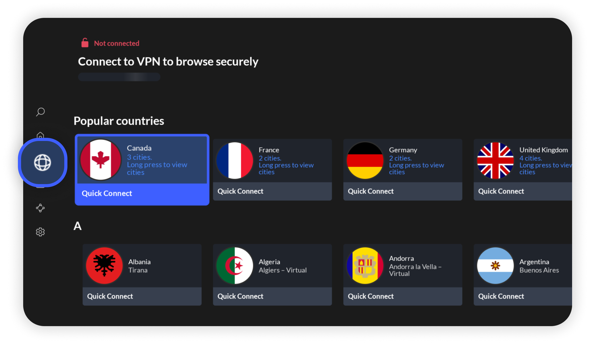 For at finde listen over NordVPN-servere på enheder såsom Apple TV skal du åbne applikationen og se landelisten på startskærmen. Du skal gå til globusikonet og rulle til højre for Android TV-enheder såsom Fire TV eller Android-bokse.