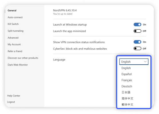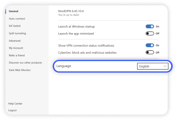 Når du har gennemført trinnene, bliver sproget i din NordVPN-app ændret til den indstilling, du har valgt.