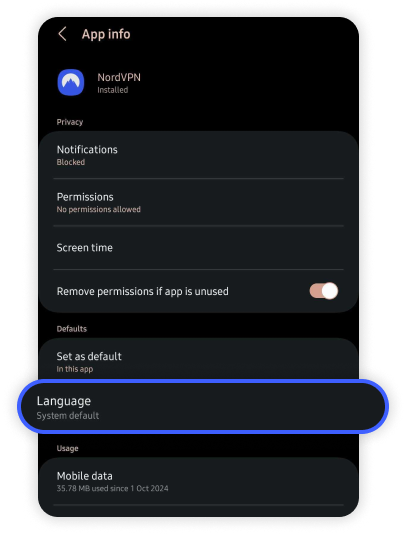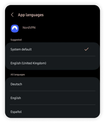 For at ændre sproget i Android NordVPN-applikationen skal du angive et af de nævnte sprog i enhedsindstillingerne. Vær opmærksom på, at trinnene kan variere afhængigt af din Android OS-version. Følg trinnene nedenfor for at komme i gang: