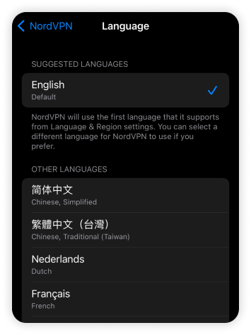 NordVPN-applikationer til iOS-enheder understøttes i øjeblikket på engelsk, tysk, spansk, fransk, japansk, koreansk, portugisisk - brasiliansk, italiensk, svensk, polsk og kinesisk (forenklet/traditionelt).