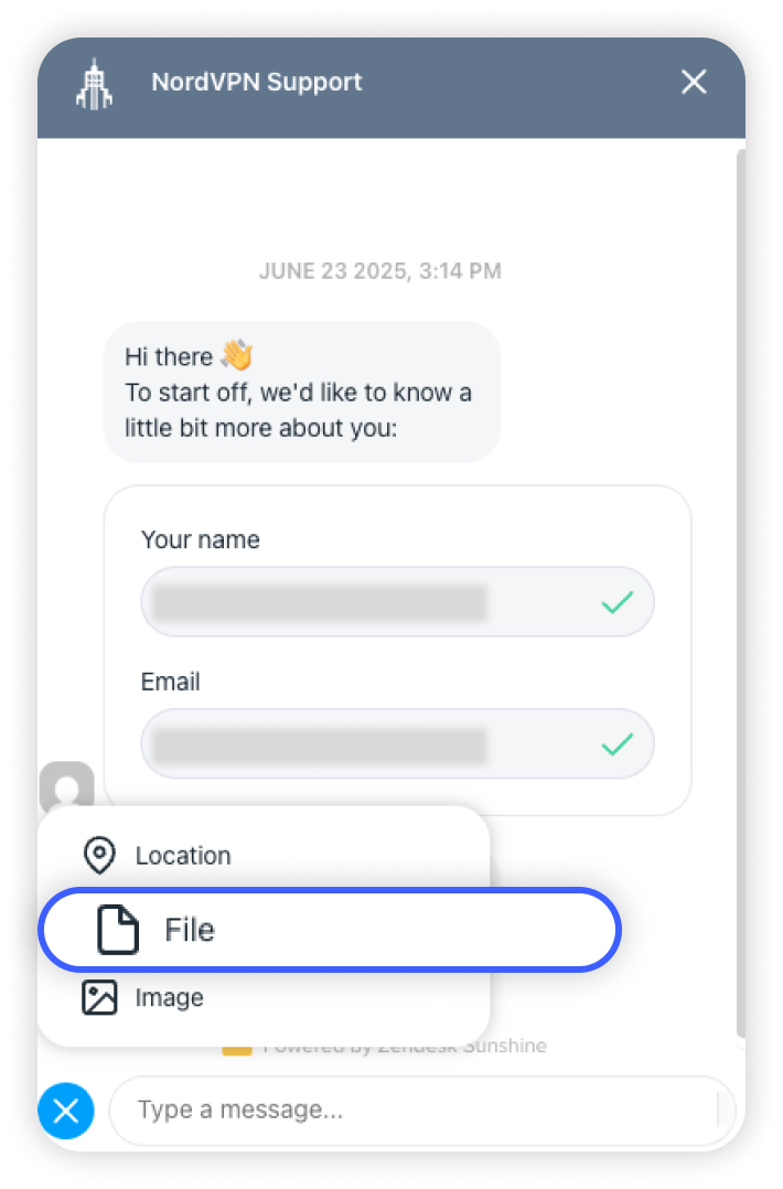 Du kan videresende diagnoserapporten via e-mail eller vedhæfte den til livechatten ved at klikke på Plusknappen i nederste venstre hjørne af chatvinduet og derefter på Fil i pop-up-menuen for upload.