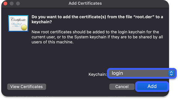 - Vinduet Tilføj certifikater (Add Certificates) vises. Klik på Tilføj (Add) for at føje certifikatet til login-nøgleringen.