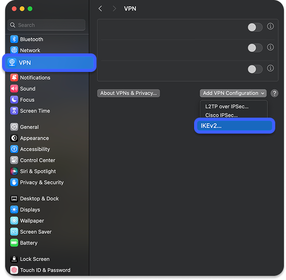 Trinnene nedenfor forklarer dig, hvordan du konfigurerer en manuel IKEv2-forbindelse på din macOS Sonoma eller nyere enhed.