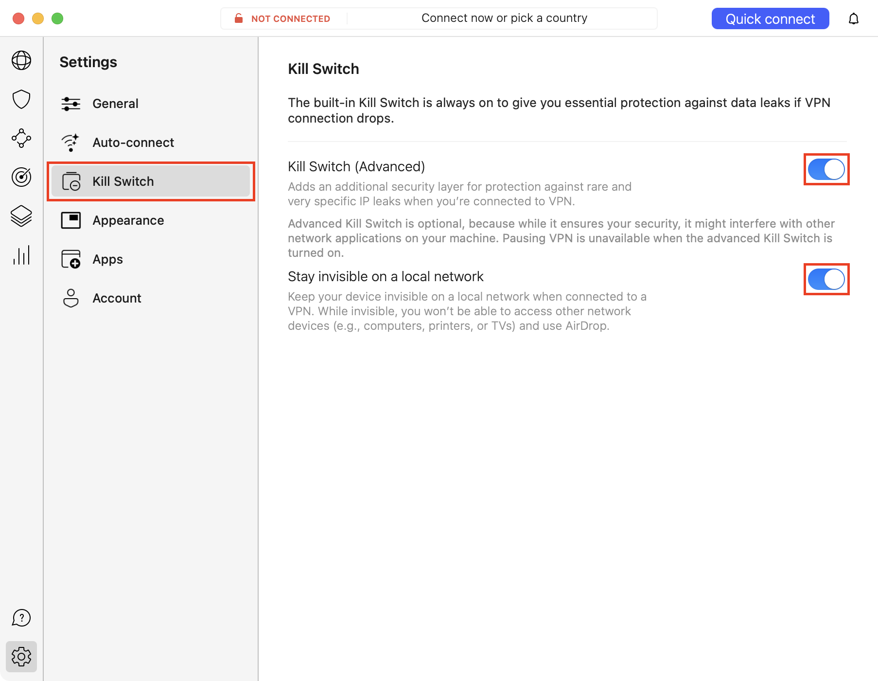Choose Kill Switch settings from the left side menu and activate Kill Switch (advanced) (if you’re using NordVPN’s App Store version).