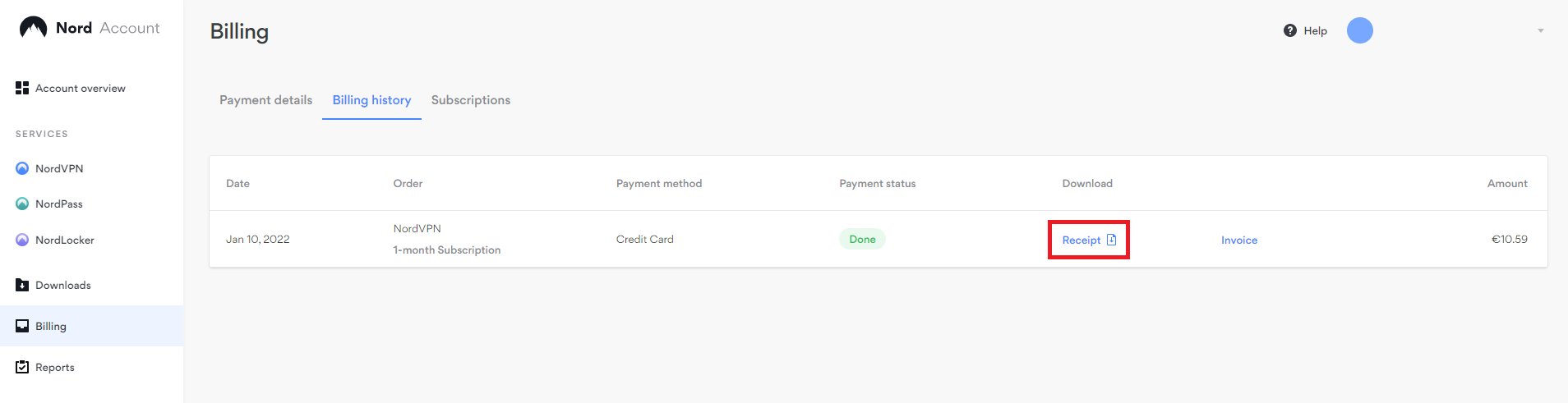 Klik på knappen Kvittering (Receipt) under kolonnen Download.