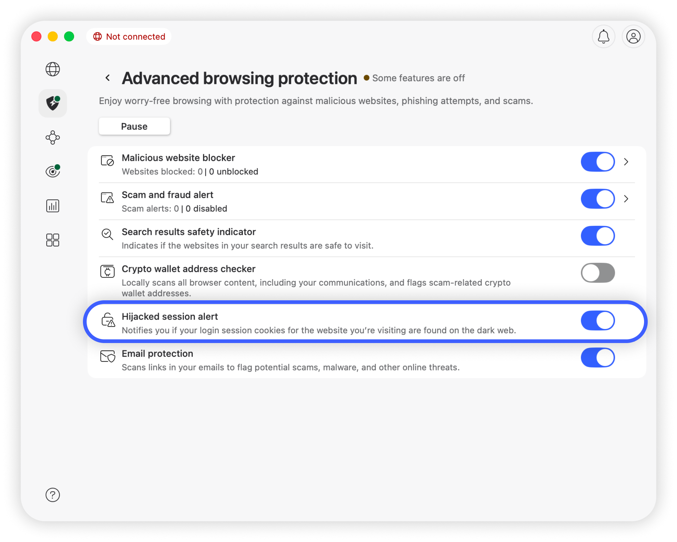 Advarslen om kapret session er en underfunktion i NordVPN's Threat Protection Pro™, som løbende tjekker og advarer brugere, når deres sessionscookies til login sættes til salg i kendte lagringssteder for databrud, f.eks. på det mørke net. Gå til vores officielle NordVPN-blog vedrørende advarslen om kapret session for at få flere oplysninger.