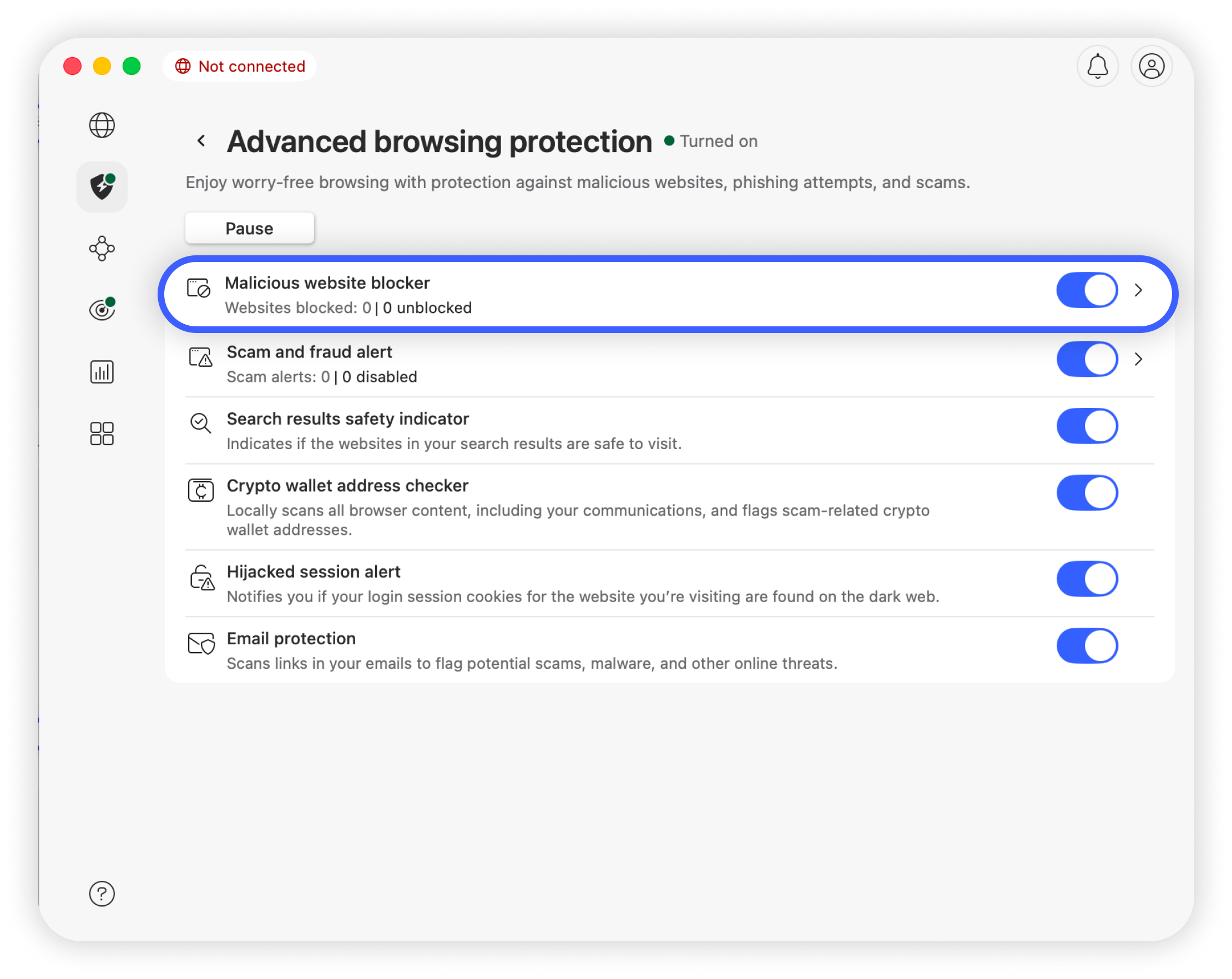 - Aktivér "Blokering af skadelige hjemmesider" ved at klikke på Til/fra-knappen: