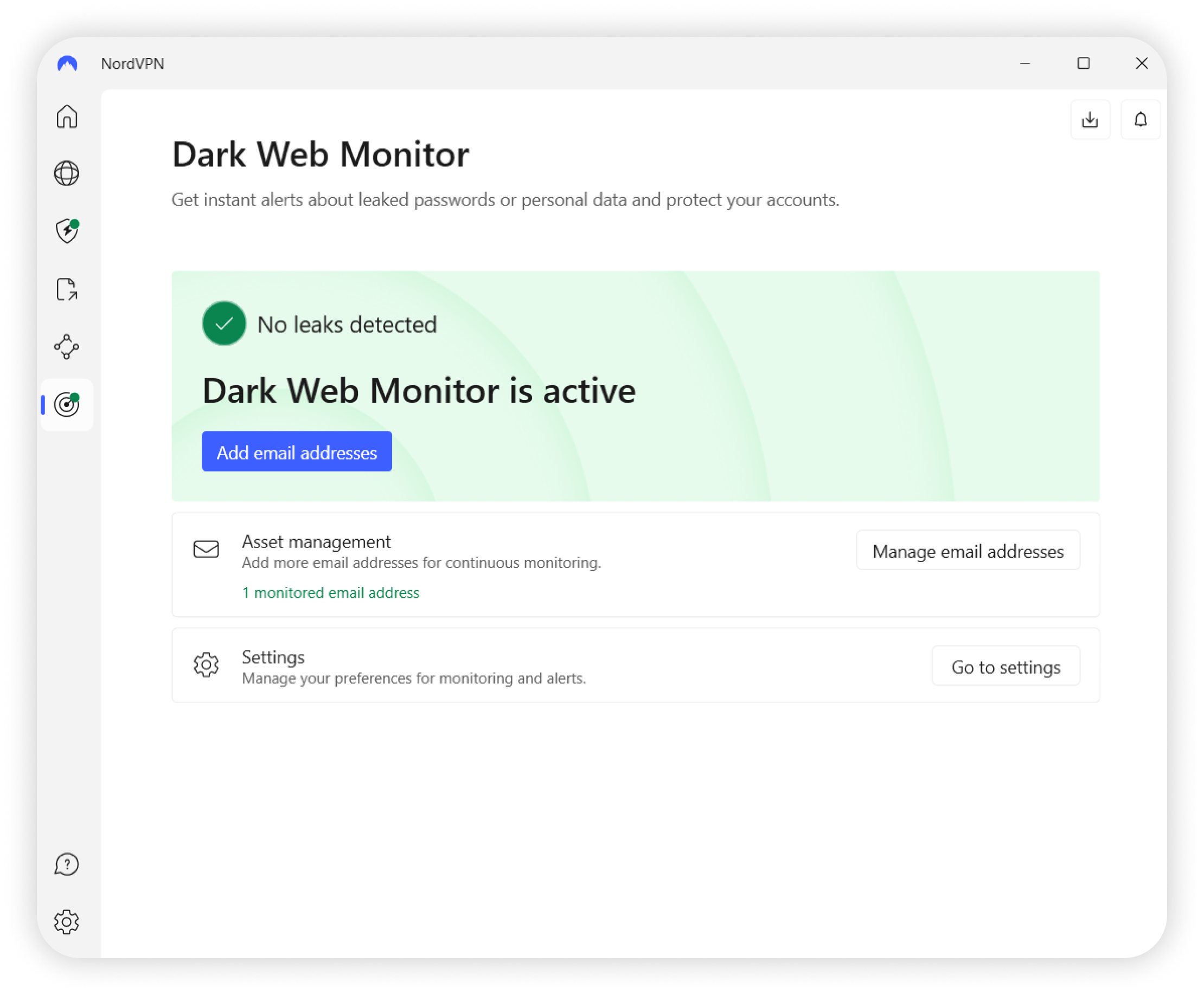 Die Dark Web Monitor-Funktion durchsucht das Internet nach Anmeldeinformationen, die mit deiner bei NordVPN registrierten E-Mail-Adresse in Verbindung stehen. Du kannst unsere Website besuchen, um weitere Informationen über unsere Dark Web Monitor-Funktion zu erhalten.