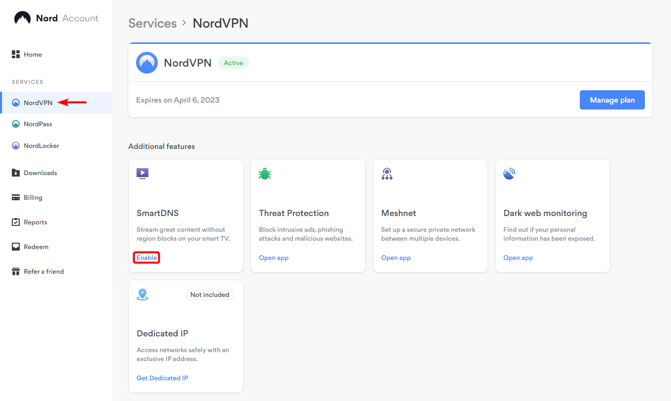 (Wenn dein LG TV beispielsweise mit Wi-Fi_123 verbunden ist, dann verbinde dein aktuelles Gerät mit demselben WLAN-Netzwerk). - Öffne jetzt deinen Nord Account und melde dich an. Klicke anschließend im Bereich Dienste auf NordVPN.