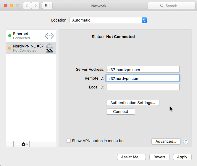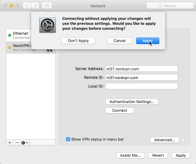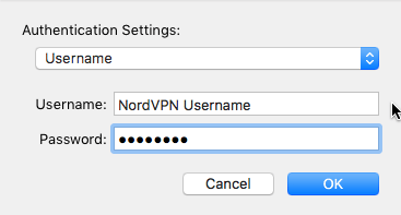 - Klicke auf Authentifizierungseinstellungen... (Authentication Settings…). Wähle Benutzername (Username) als Authentifizierungsmethode und gib dann deinen NordVPN-Benutzernamen und dein Passwort ein. Klicke auf OK und dann auf Übernehmen (Apply).