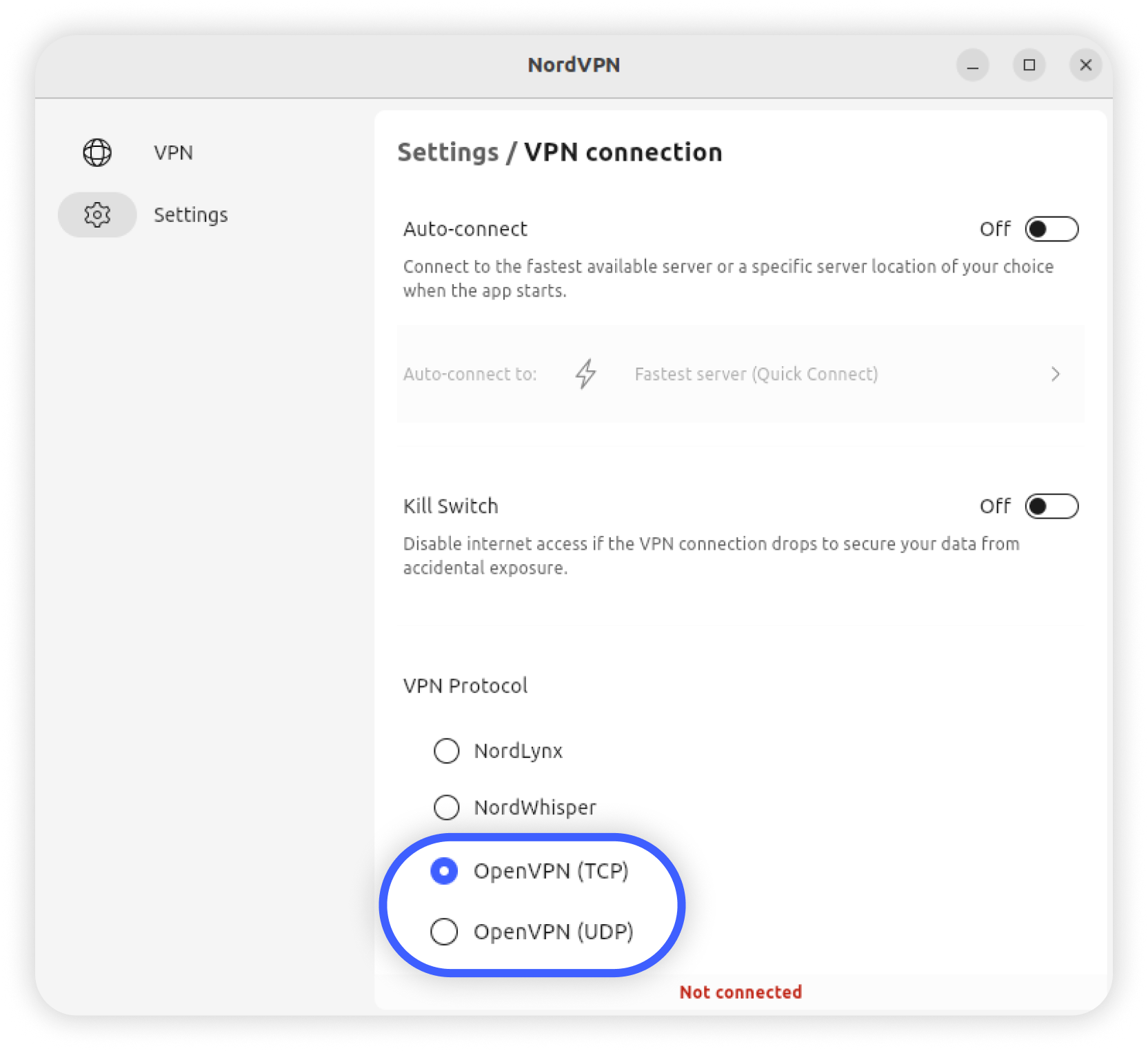 NordVPN hat eine grafische Benutzeroberfläche (GUI) für Linux veröffentlicht, die gleichzeitig mit der bestehenden CLI-Anwendung verwendet werden kann. Wir bieten .deb- und .rpm-Pakete an, die mit Debian 10 oder neuer, Ubuntu 18.04 oder neuer, Linux Mint 19 oder neuer und Fedora 32 oder neuer kompatibel sind. Auch Community-gestützte Distributionen sind möglich, aber wir bieten nur begrenzte Unterstützung bei distributionsspezifischen Problemen. Außerdem unterstützen wir GNOME- und KDE-Desktop-Umgebungen. Wir empfehlen die native NordVPN-Anwendung, wenn du mit einem Linux-Gerät eine Verbindung zu den Servern von NordVPN herstellen möchtest. Zur Verwendung der grafischen Benutzeroberfläche muss die CLI-Anwendung installiert sein. Die GUI ist über DEB- und RPM-Pakete verfügbar, Snap soll in Zukunft veröffentlicht werden.