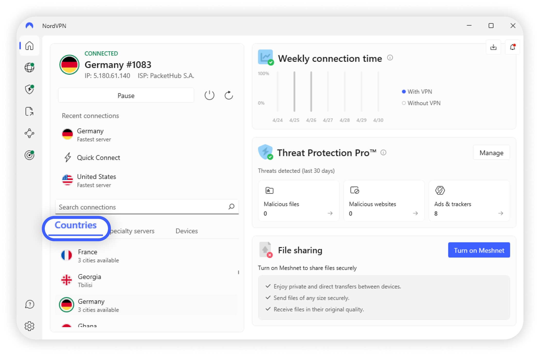 NordVPN has over 8,400+ servers in 167+ countries around the world. In addition to standard VPN servers and locations, such as NordVPN Canada or NordVPN USA, you can choose servers optimized for specific purposes, such as P2P sharing or connecting from countries with internet restrictions. If you want to learn more about our servers, you can visit our article detailing the different NordVPN server categories.
