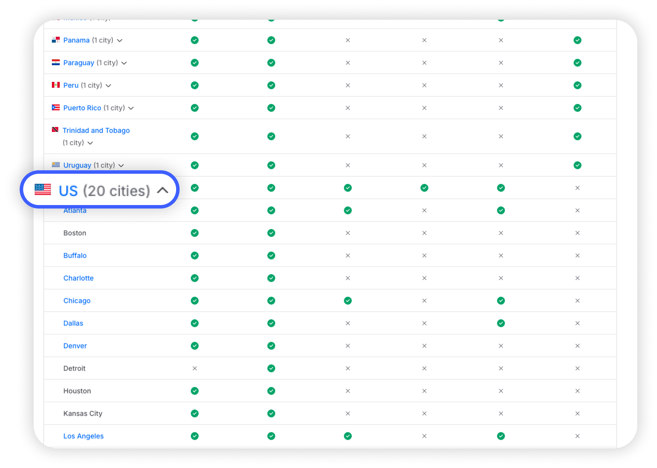 For example, Canada has five checkmarks, meaning it has many regular servers, P2P servers, a few Double VPN servers, and many Dedicated IP servers, but no Virtual ones.