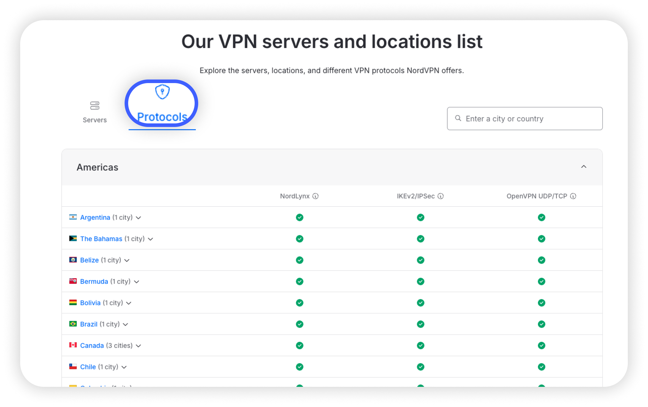 This section shows which countries support which protocols. The possible protocols are Nordlynx, IKEv2/IPsec, and OpenVPN UDP/TCP. To learn more and to know which protocol could be best for you, visit our article about all NordVPN protocols.