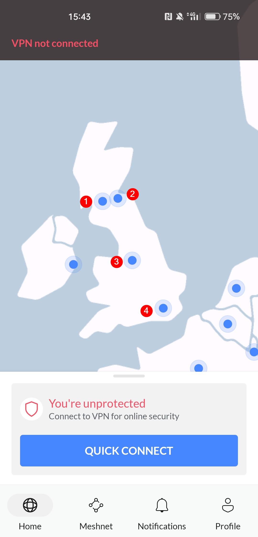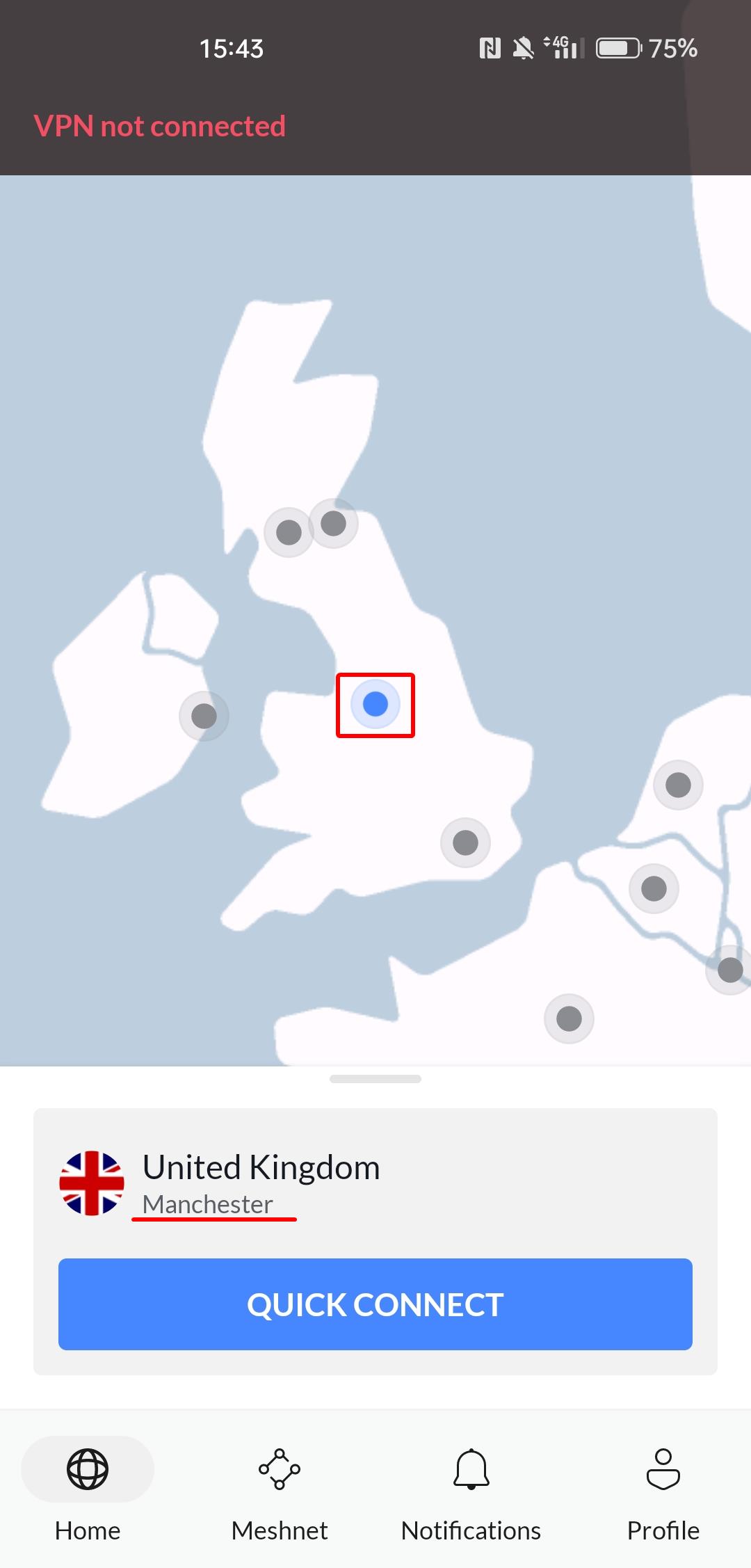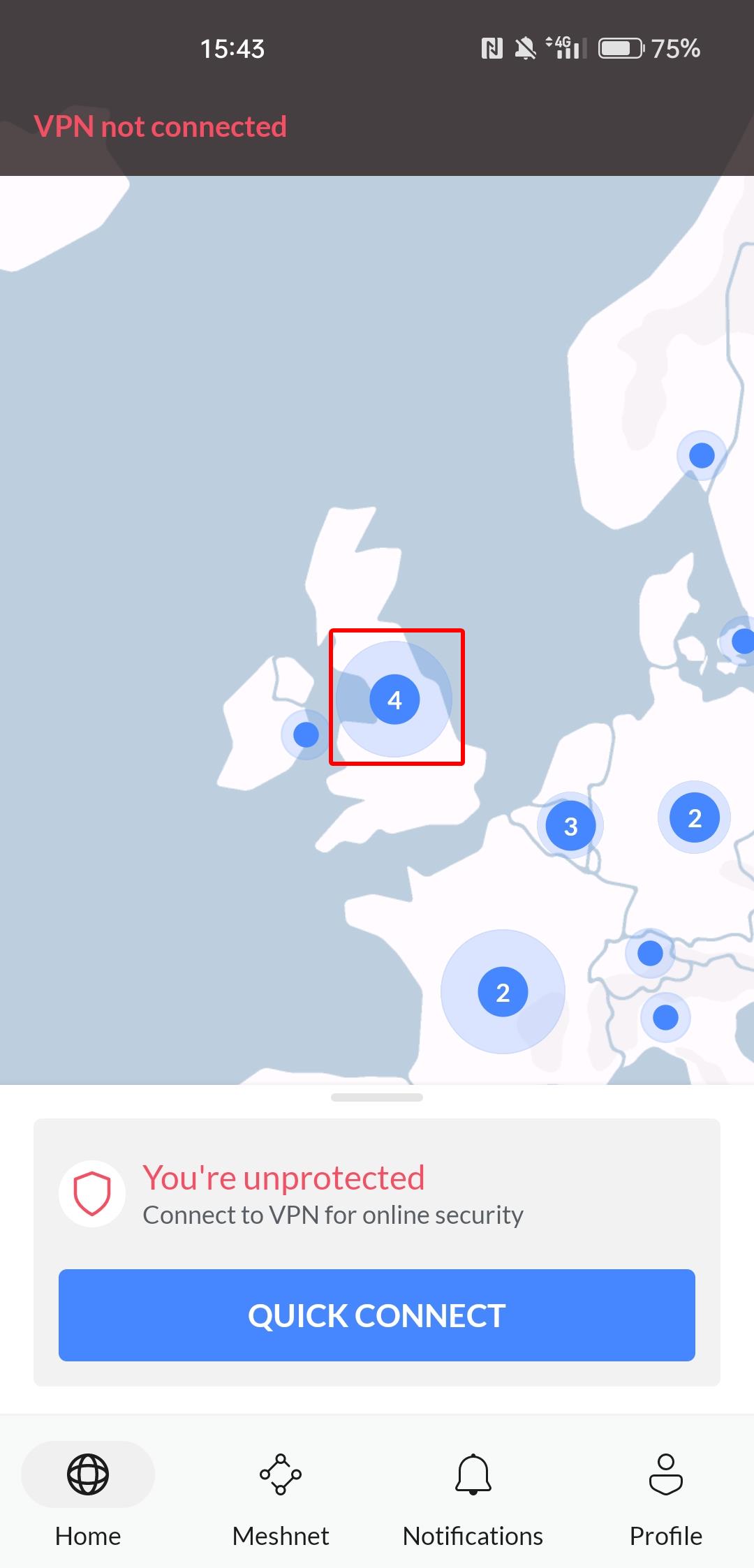 Alternatively, the pins on the world map signify where we have servers and the number of them in the country. Pressing on them will show you the exact city servers we have. You can tap on different pins without a number and connect to any desired city.