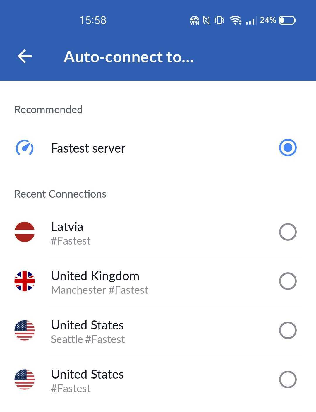 2. If you choose to automatically connect to the Fastest available server, you will be able to choose one of the servers from your Recent Connections, one of the Specialty servers, or a server in a specific country.