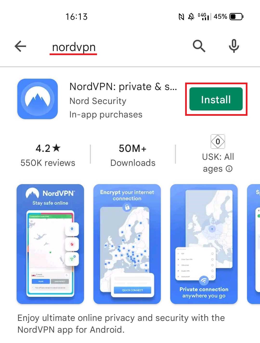 2. Enter NordVPN in the search bar and select the NordVPN app. Tap Install.