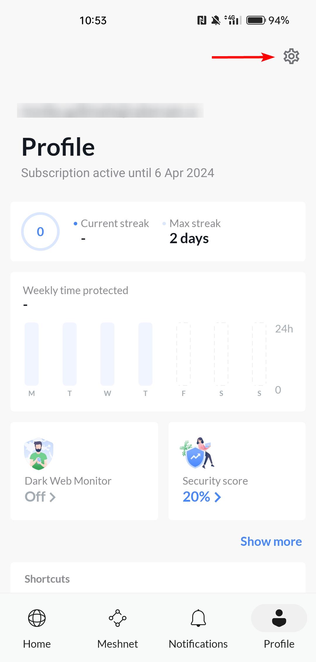 6. Profile: by tapping here you can find your connection statistics and by pressing this cogwheel icon you will open the settings menu.