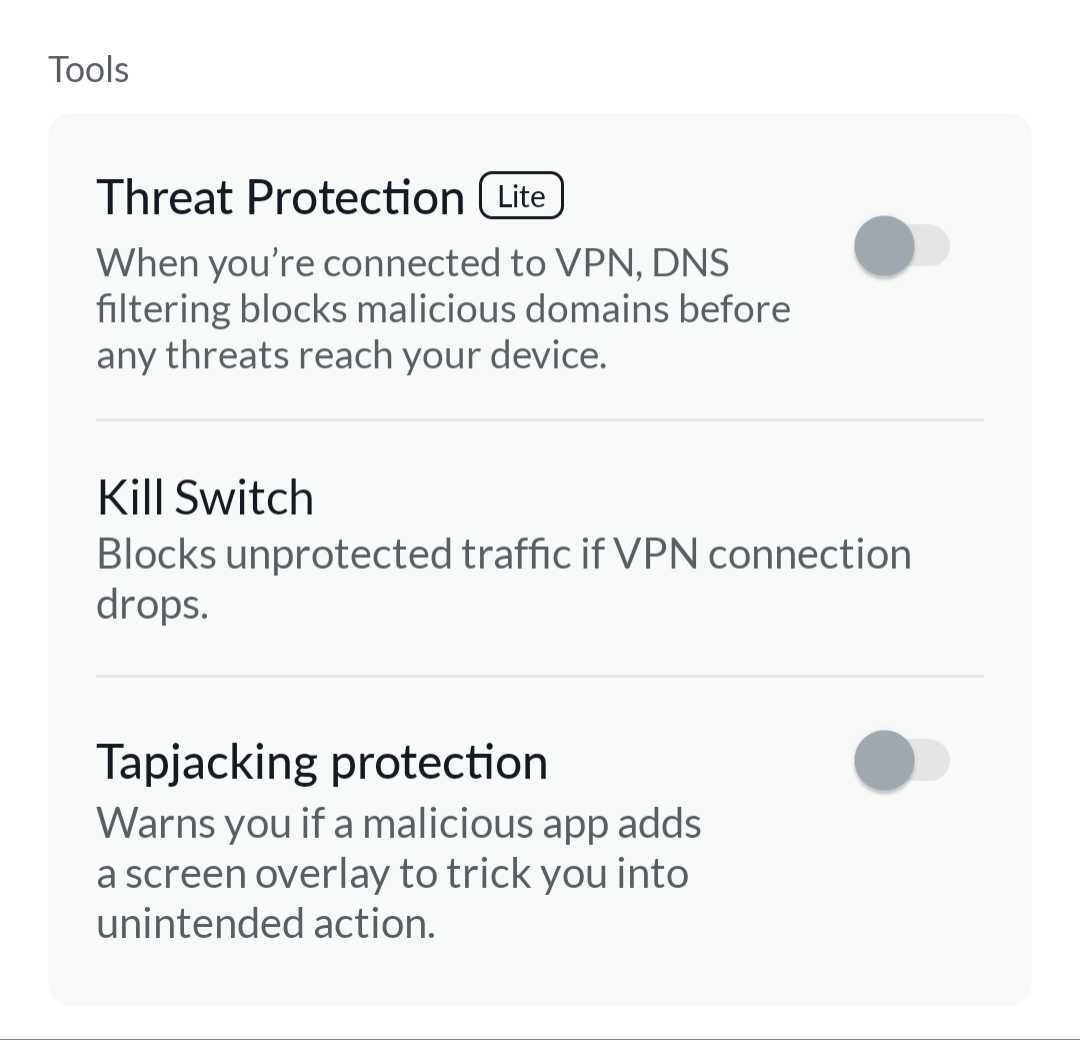 Tapjacking protection: keeps you safe from unintentional disconnects by requiring 2 steps to disable VPN.
