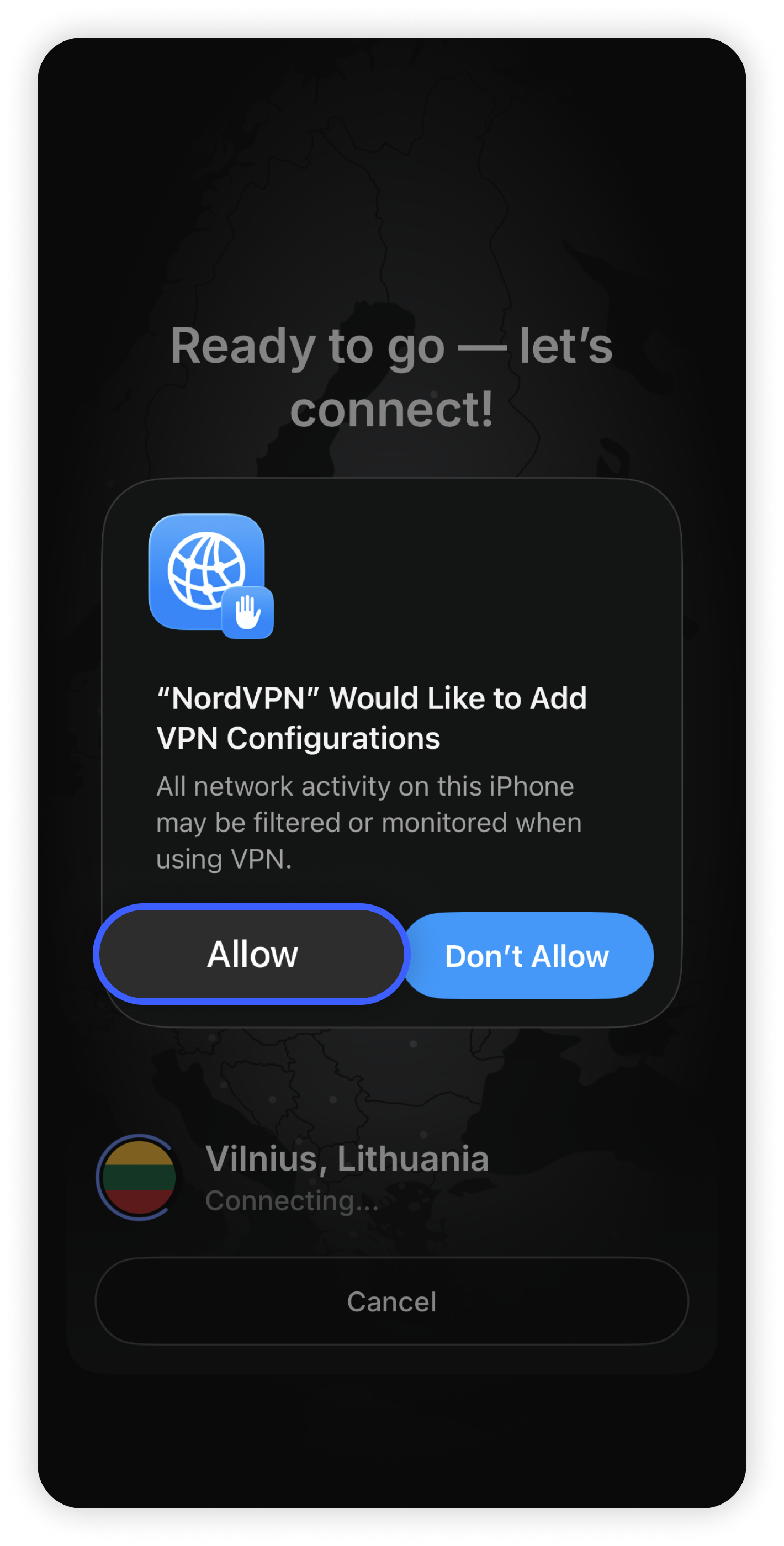 - When connecting for the first time, a prompt will appear regarding VPN configurations. Tap "Allow," otherwise you will not be able to connect.