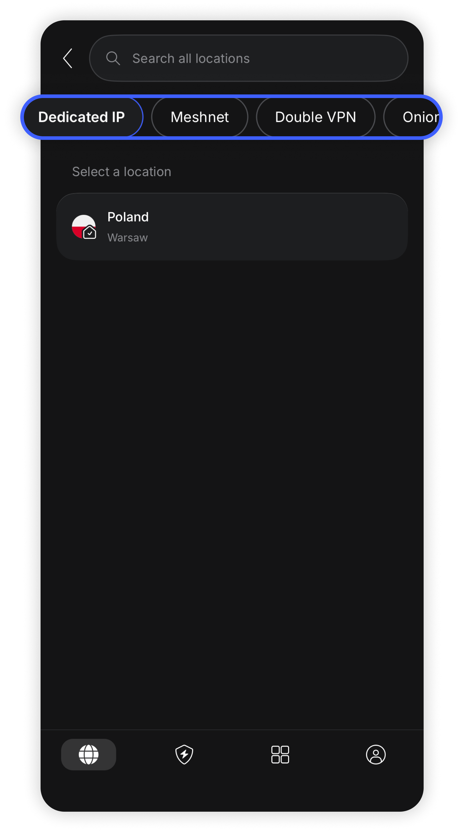 - To connect to a specialty server, such as a dedicated IP, obfuscated, or Double-VPN server, tap "All locations" and select one of the server groups above.