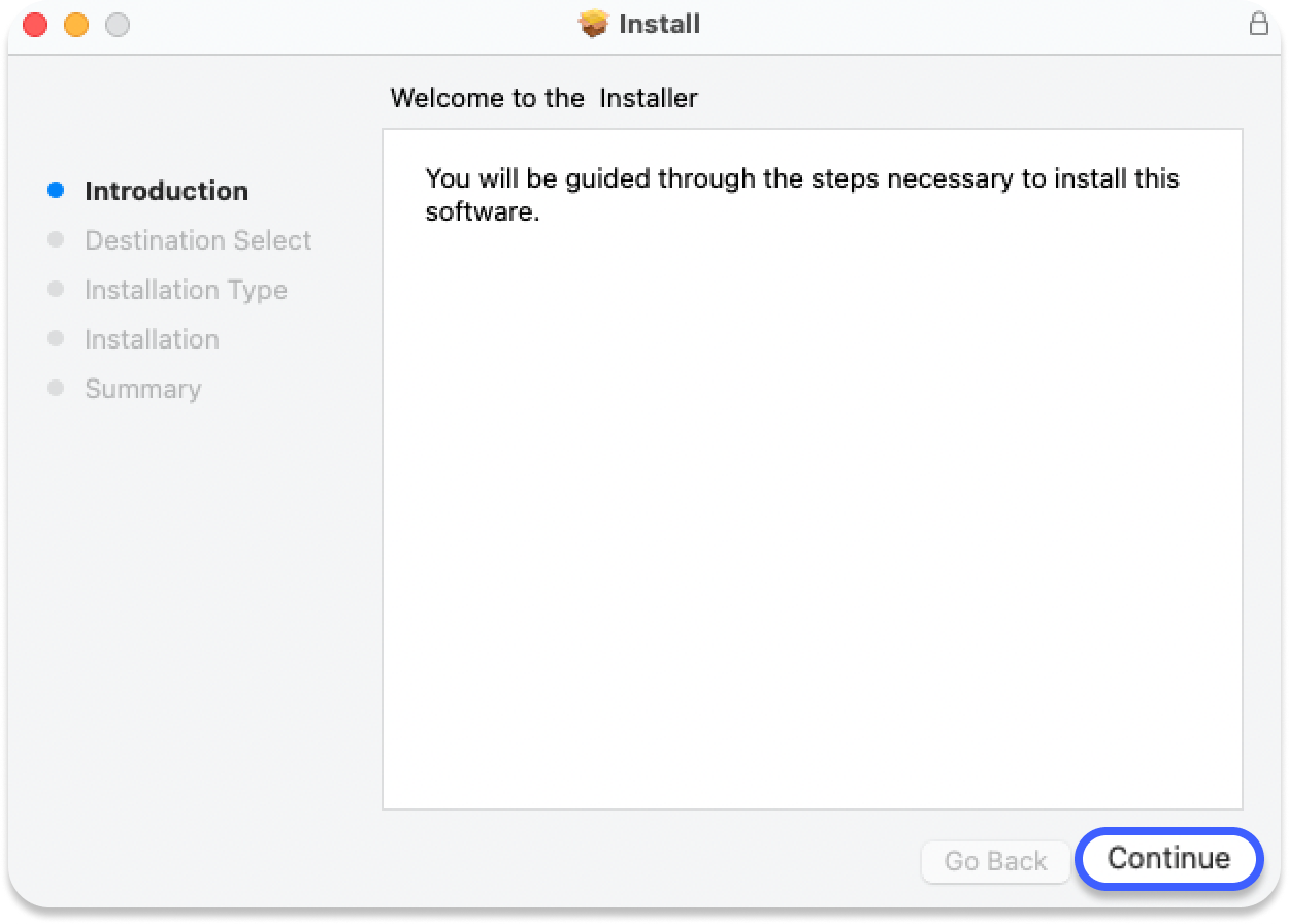 NOTE: Ensure the file is saved directly on your device, not in a cloud-synced folder like Dropbox. - An installer window will open. Click "Continue," then "Install."