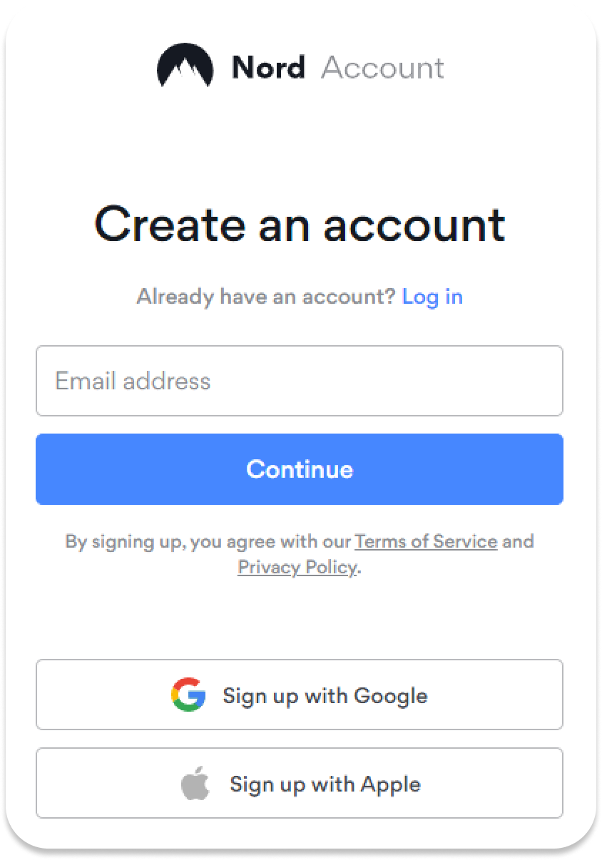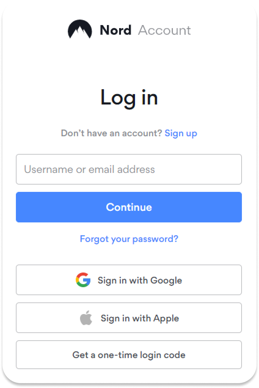 NOTE: You may be redirected to a URL other than nordaccount.com for login, as domains can vary by region. - To log in, enter your email address and password, or use Google, Apple, or a code:
