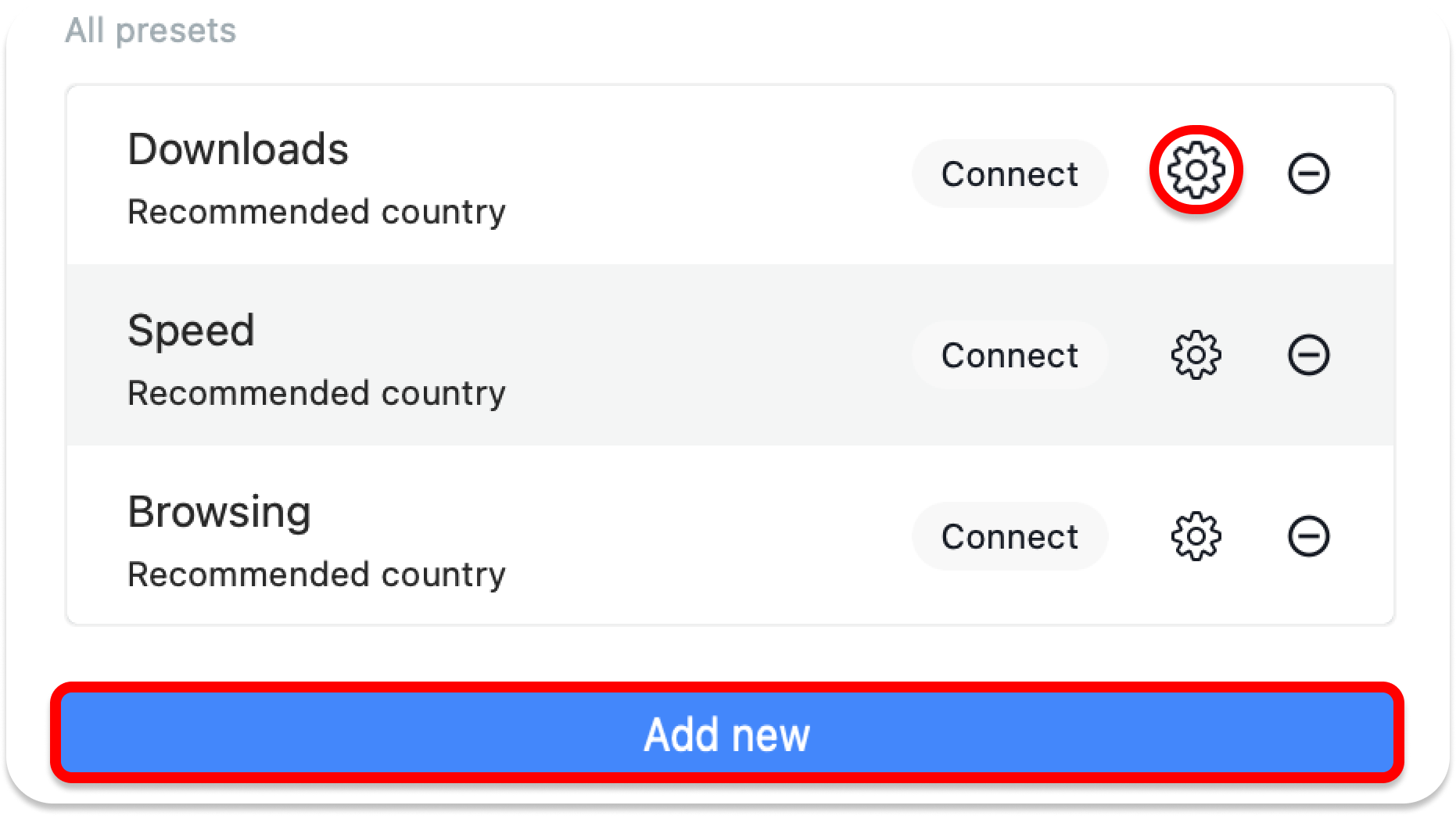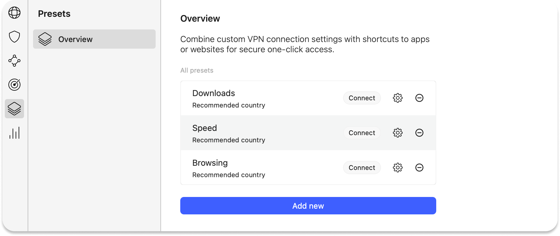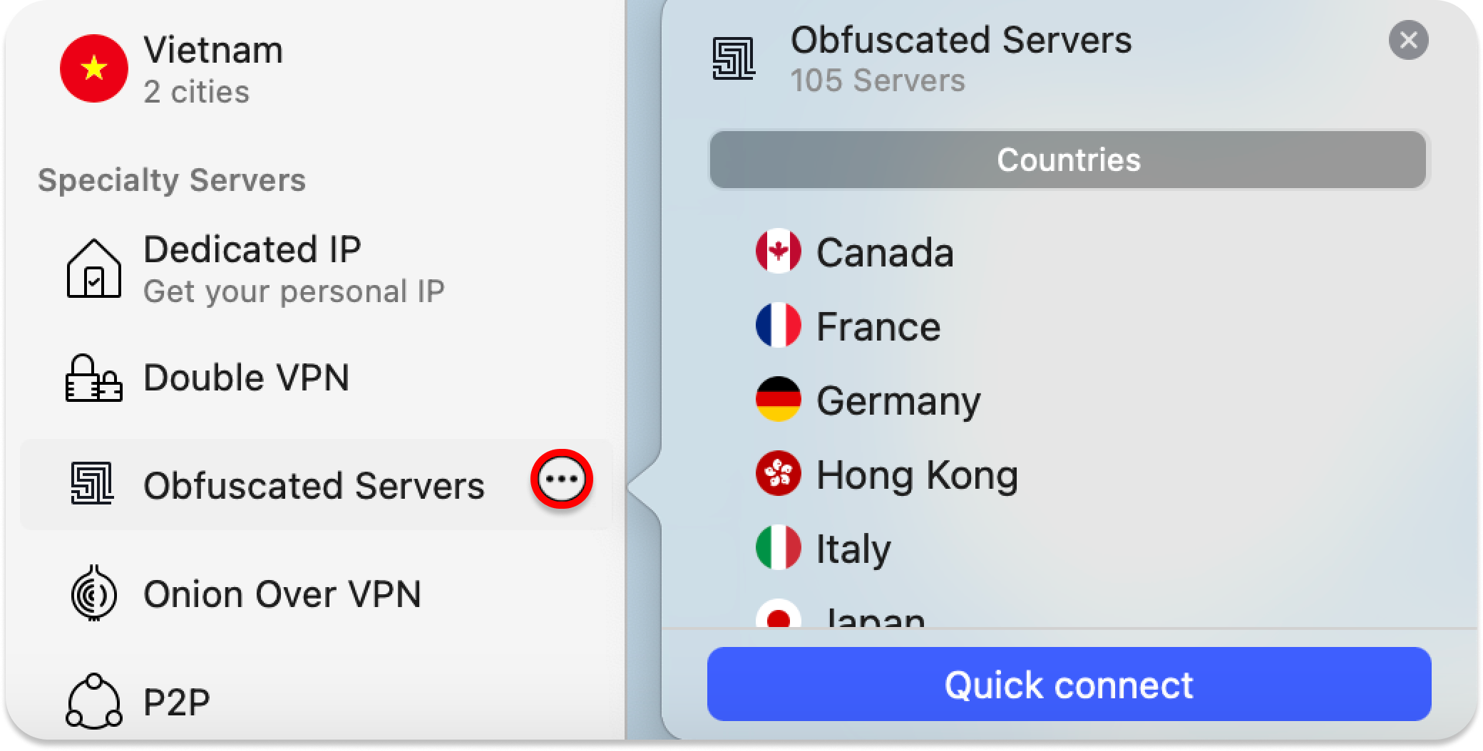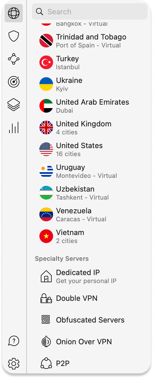 - Connect to Specialty Servers. Find the "Specialty Servers" list in the left sidebar. Hover over a category and click the three-dot menu to select a country.