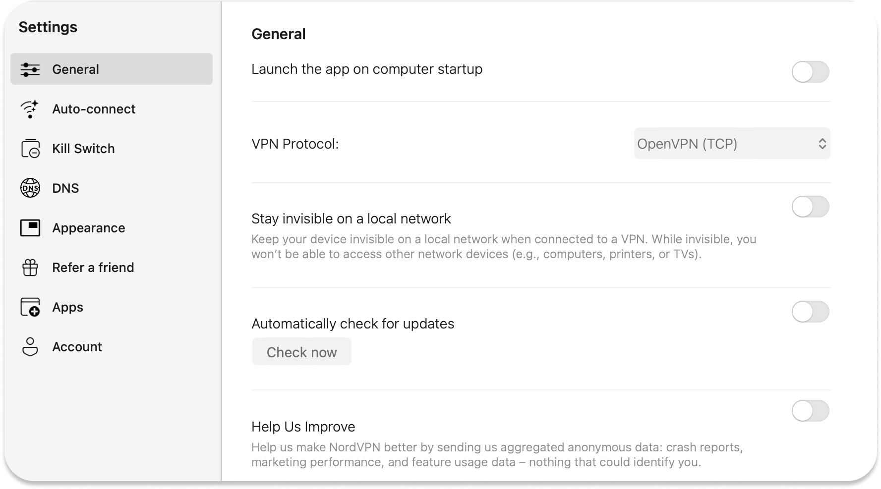 - In the "General" settings, set the app to launch on startup, choose your VPN protocol, enable post-quantum encryption, and turn on Invisible on a local network.