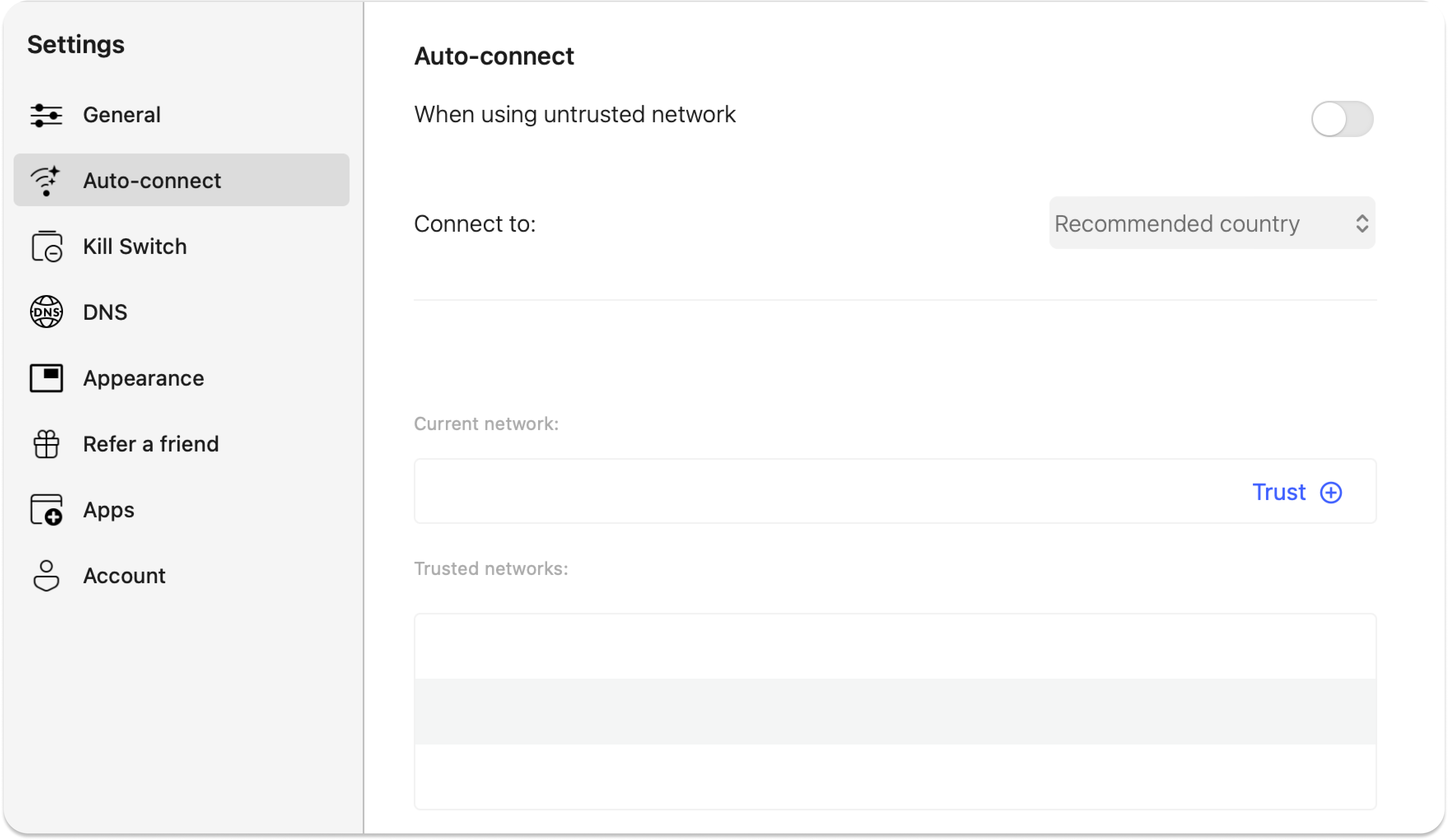 - Use the auto-connect settings to have the app automatically connect when you join an untrusted network.