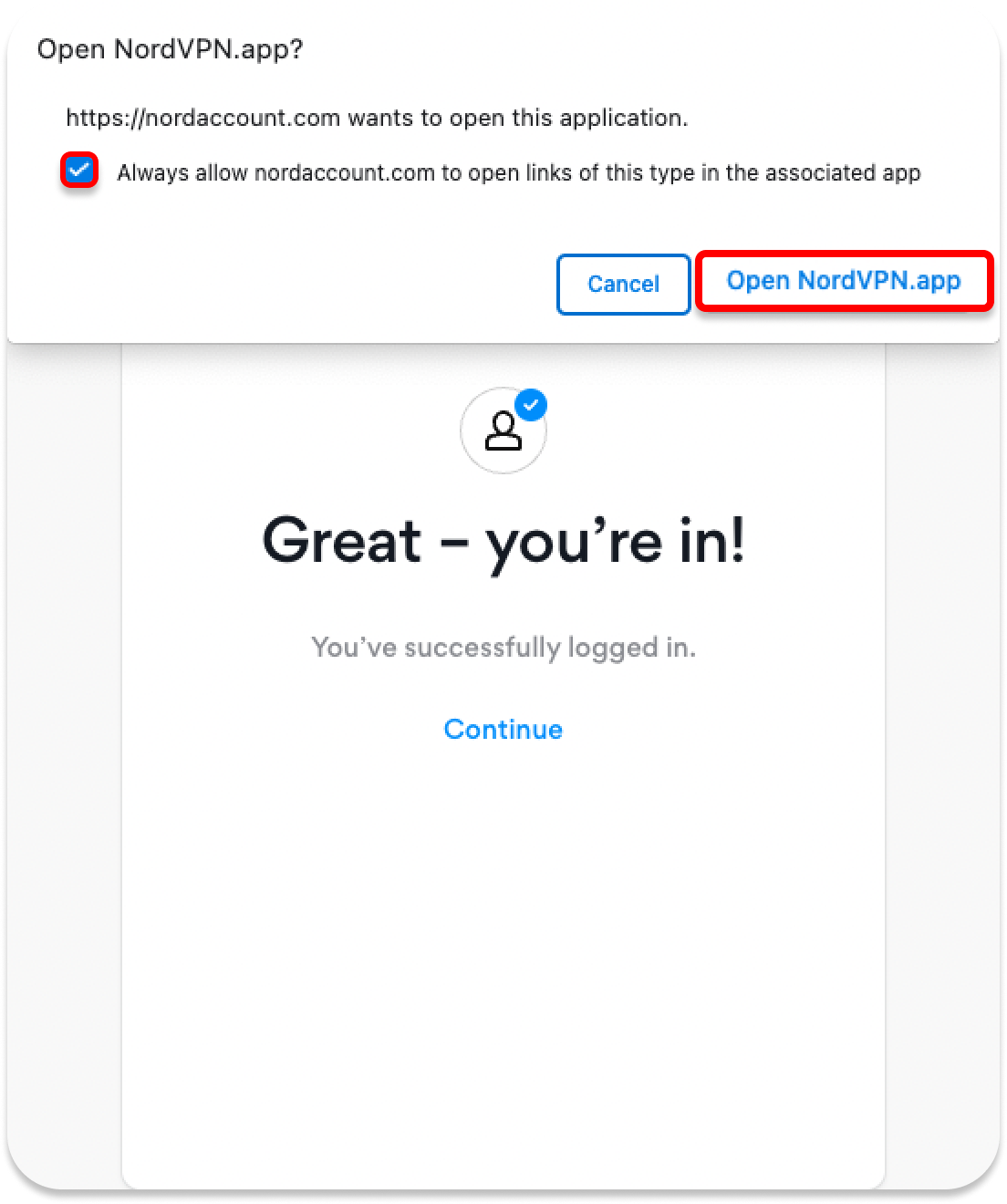 - After logging in through the browser, you will be prompted to open the NordVPN app. Agree to always allow Nord Account to open the app.