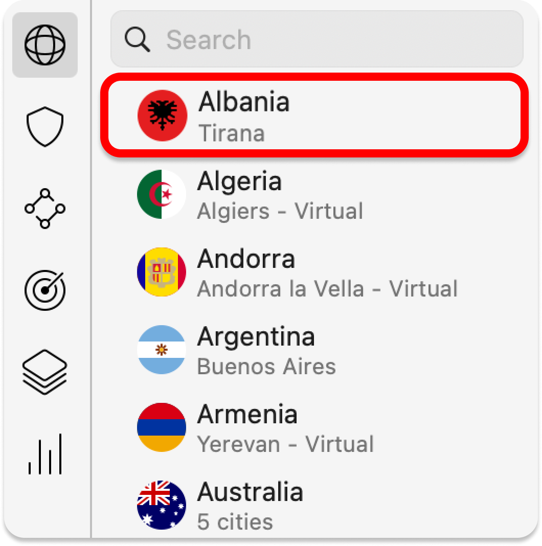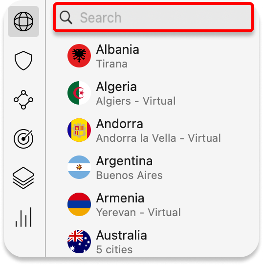 - To choose a specific location, you can type a country's name into the search bar or scroll through the list and click the one you want.