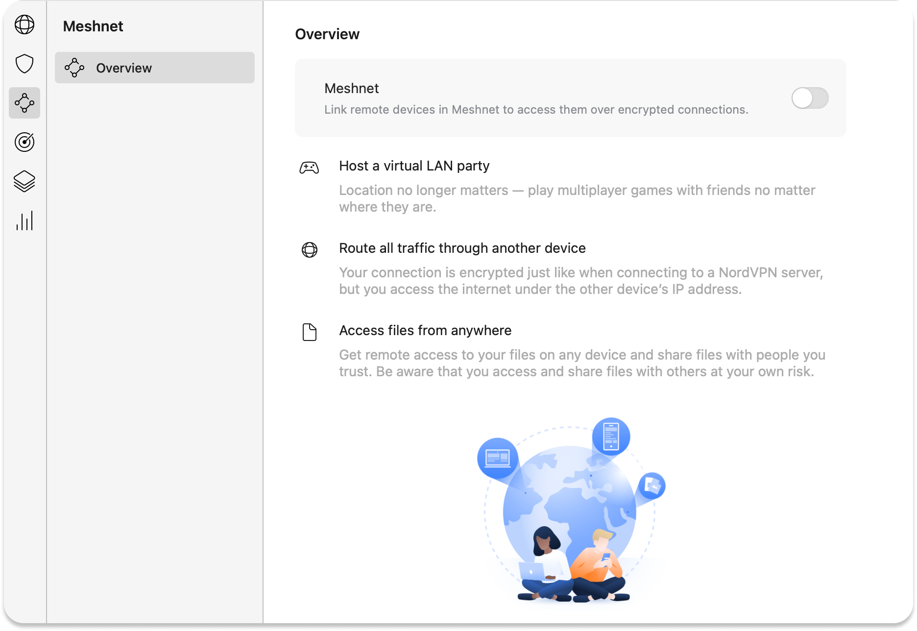 - Use Meshnet. Click the interconnected dots icon in the left sidebar of the NordVPN application to access other devices over a secure, encrypted tunnel.