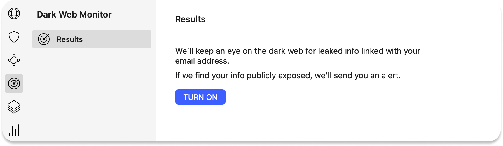 - Activate Dark Web Monitor. Click the radar-style icon in the left sidebar of the NordVPN application to scan for leaks associated with your NordVPN email address.