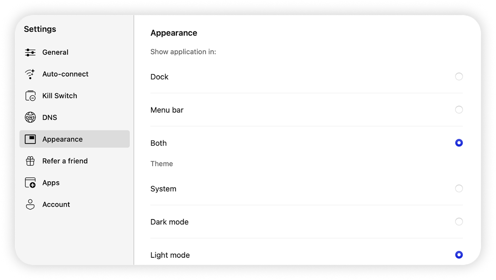 Appearance settings let you add an application to your dock, menu bar, or both and choose between dark and light modes.