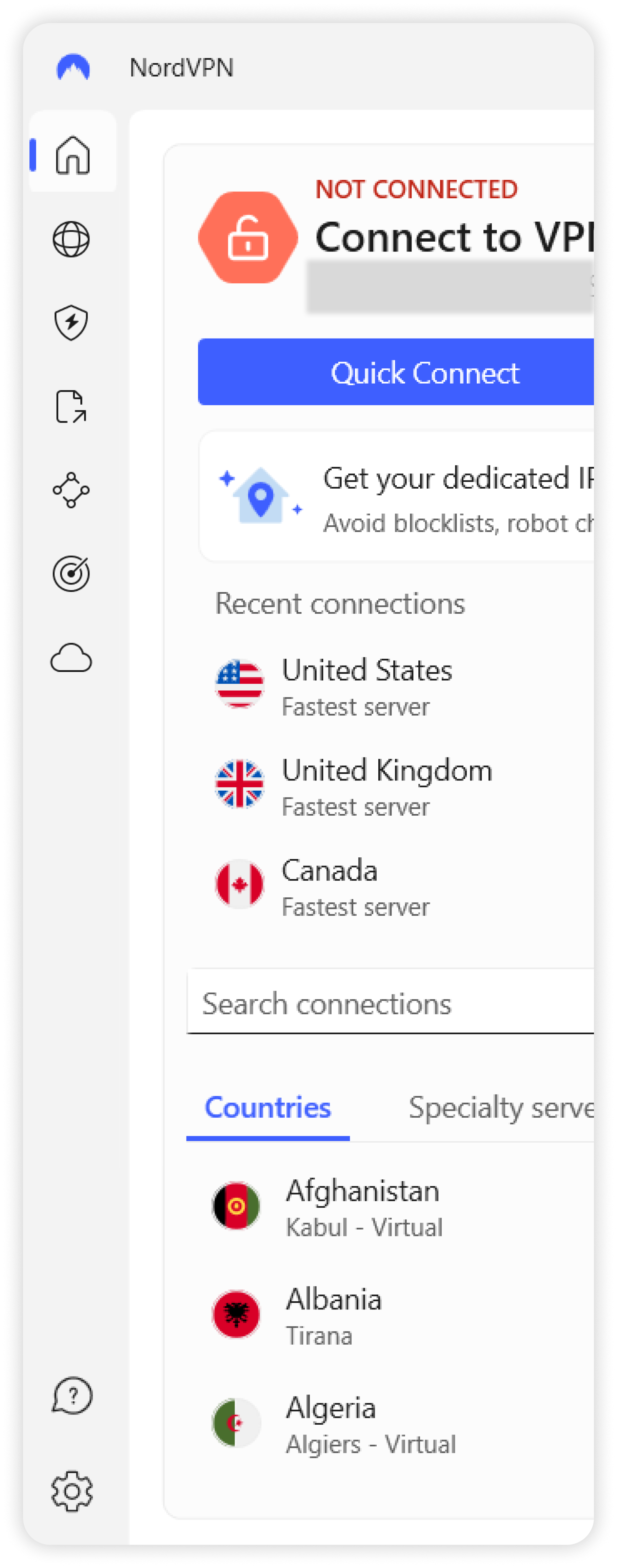 - Specialty servers: NordVPN offers multiple categories of servers, each with unique benefits. Visit differences between Specialty servers for more info.