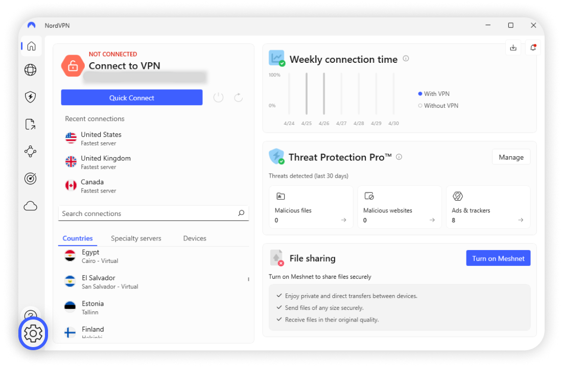 You can find all the additional features NordVPN offers on the left side of the menu: