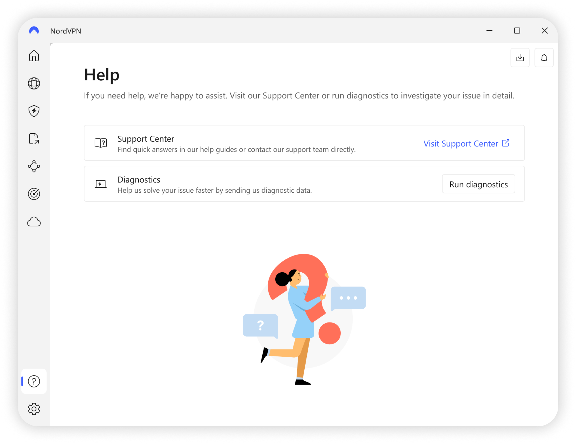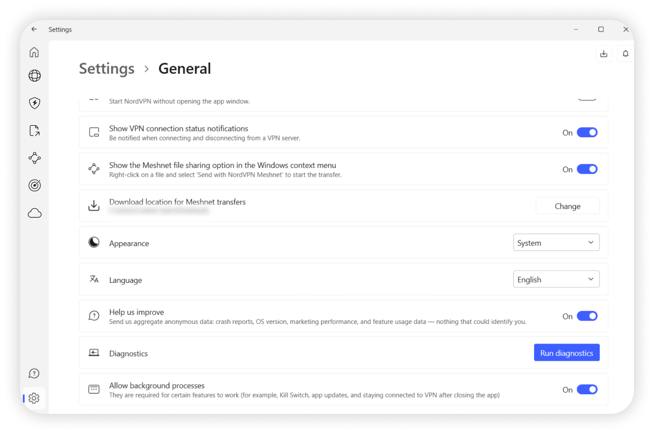 - Collect diagnostics for troubleshooting with NordVPN support.