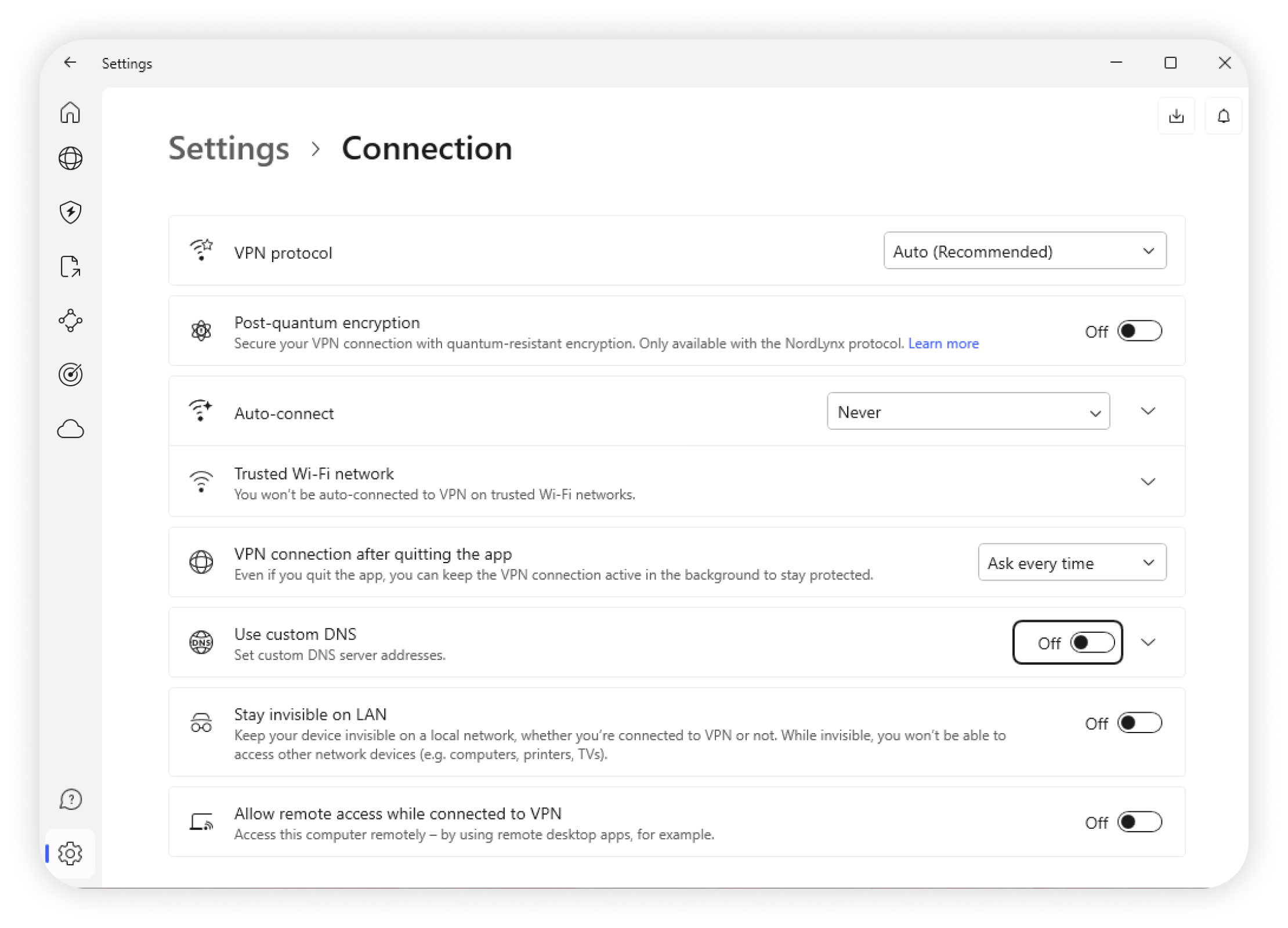 - The Custom DNS feature lets you specify a particular DNS server for the NordVPN application to use while connected instead of our servers.
