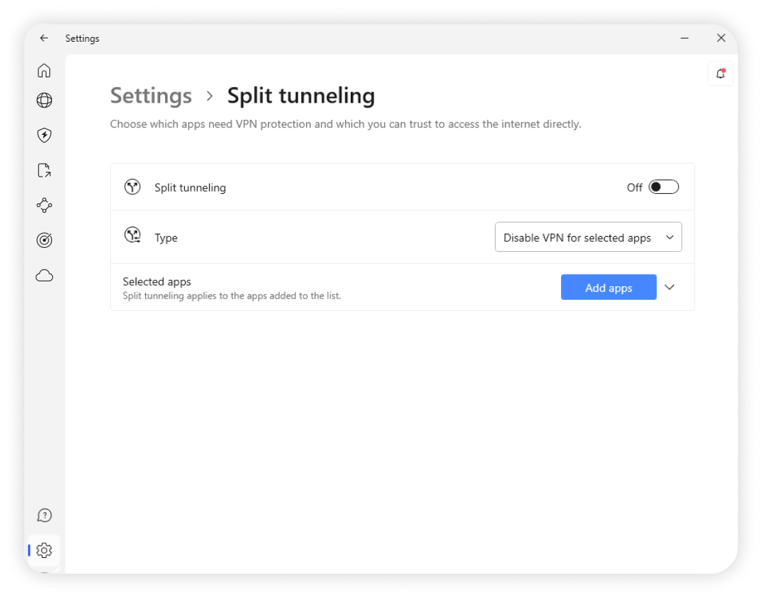 Split tunneling allows you to exclude applications from the VPN connection. In other words, the apps you select to add to the split tunneling feature will enable them to stay unaffected by NordVPN. You can visit our guide on the Split tunneling feature to learn more about it.