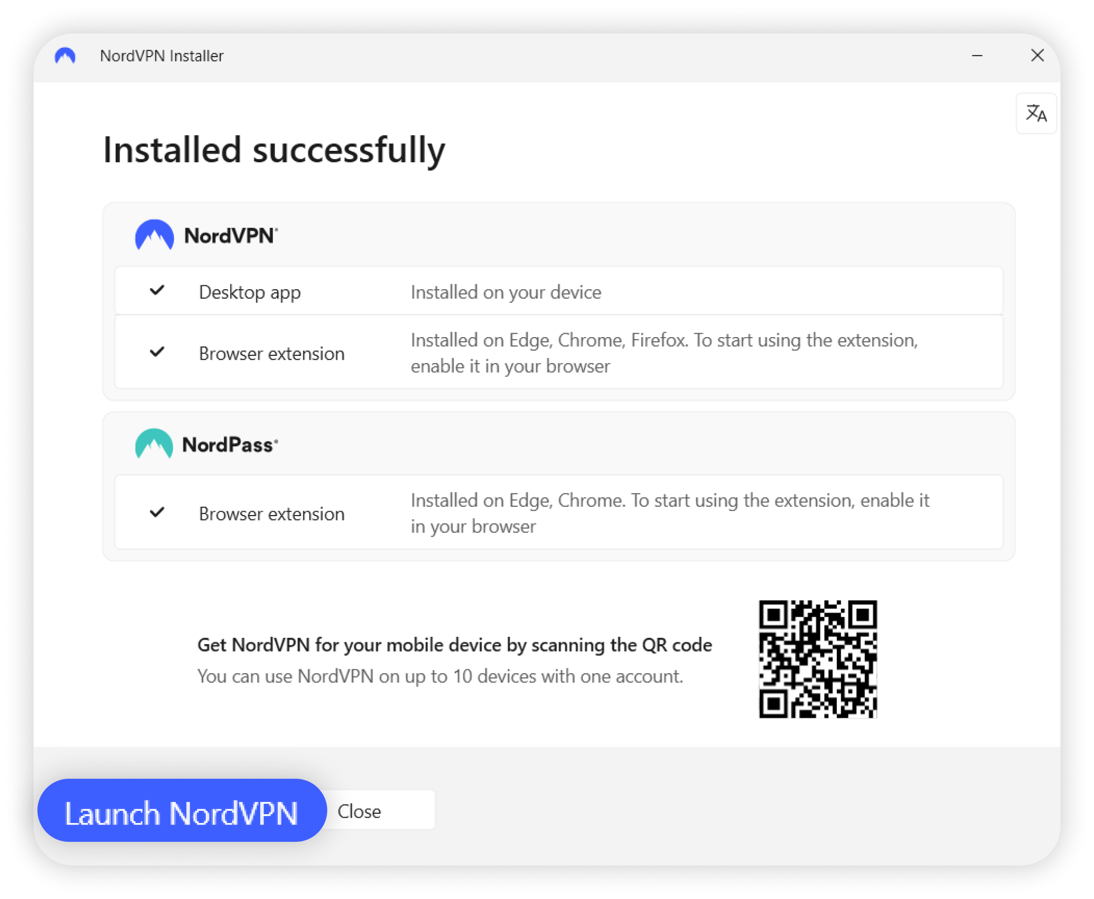 - Once the installer finishes, the program will ask if you want to launch NordVPN immediately. Click Launch NordVPN or Close to complete the setup.