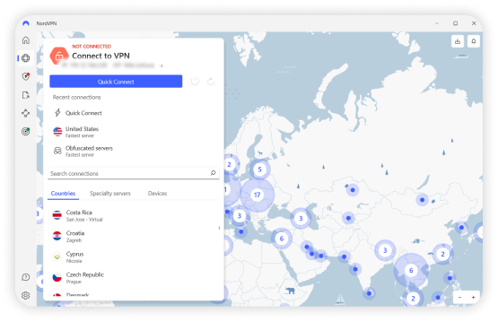 Click on the nodes on the map or the specific country in the list to connect to the best server in the given location. Additionally, clicking on the three dots next to the country name reveals additional connection options, such as selecting a specific city.