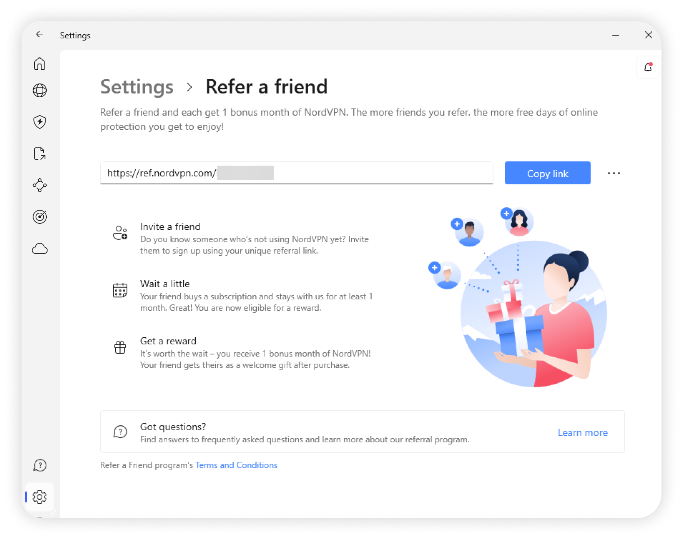 It provides your personal referral link, which you can share with your friends and family, and receive a reward for. Visit our website to learn more about how to earn a NordVPN subscription by referring a friend.