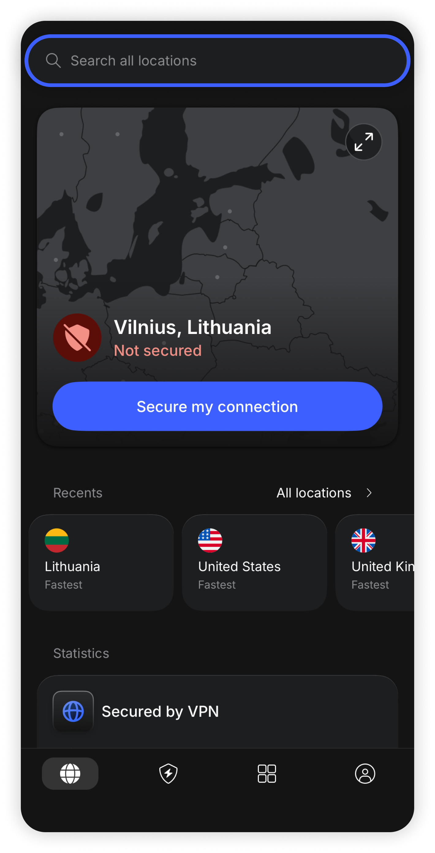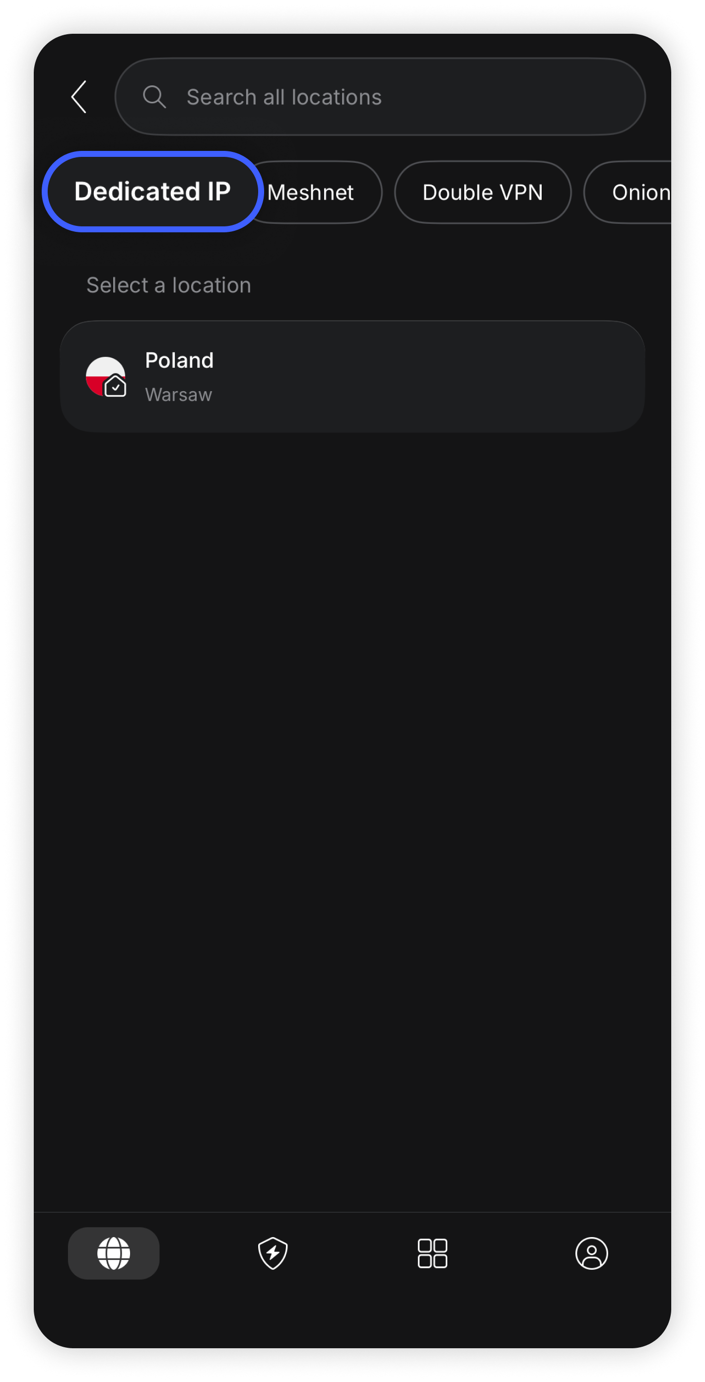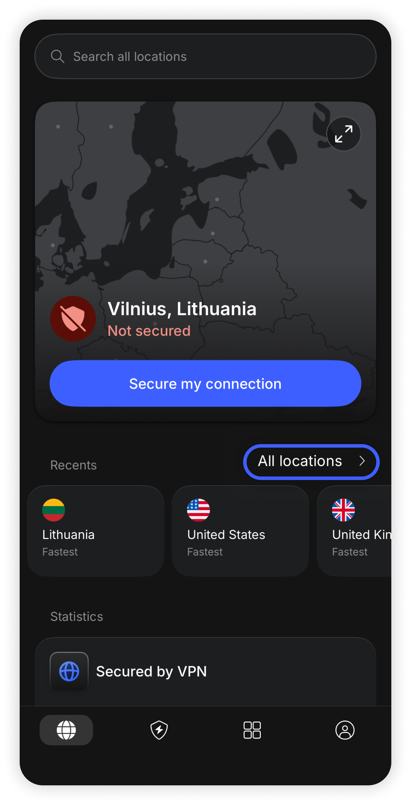 - If you want to choose a different server, on the homepage (globe icon), tap "All locations."
