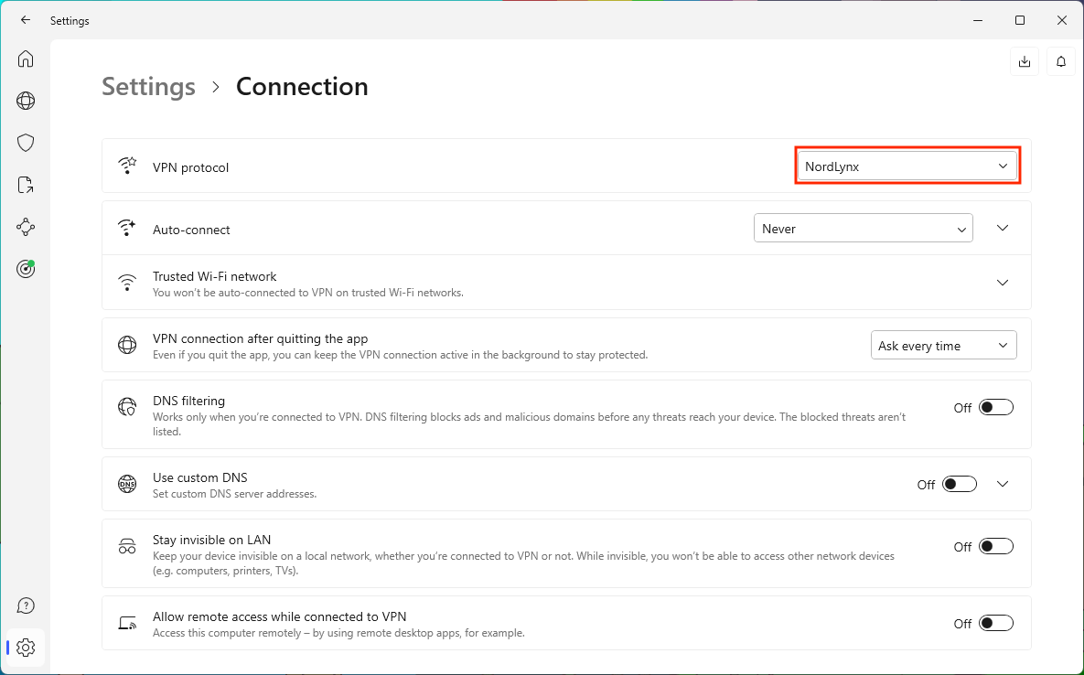 Once you reconnect, your Windows device will be connected to the VPN using the NordLynx protocol.