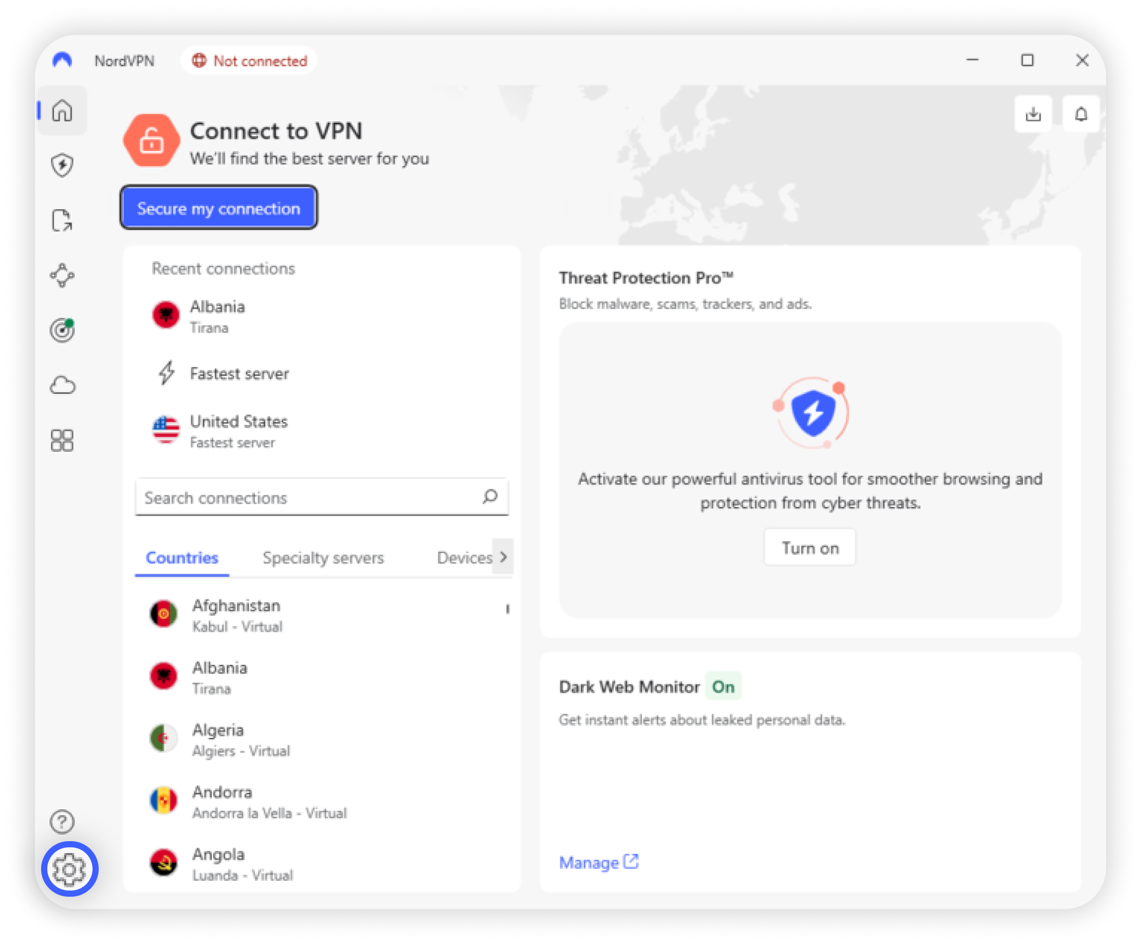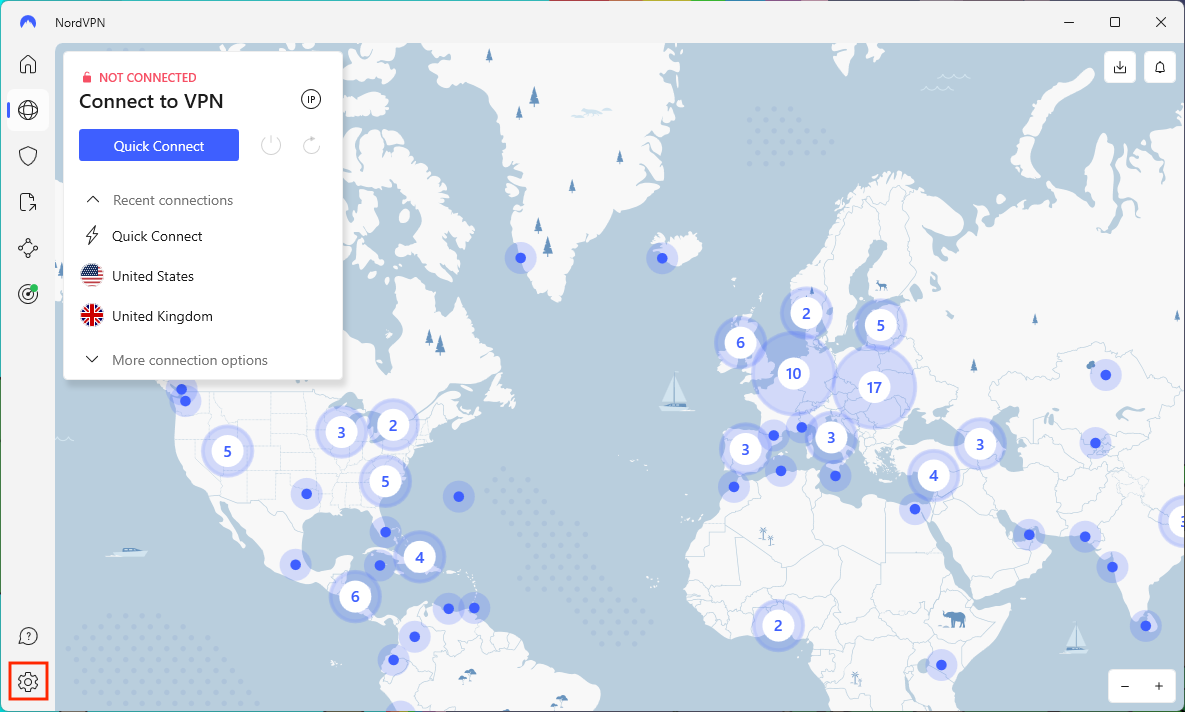 - Install the NordVPN app for Windows and go to the application settings by pressing the cog icon in the bottom left corner: