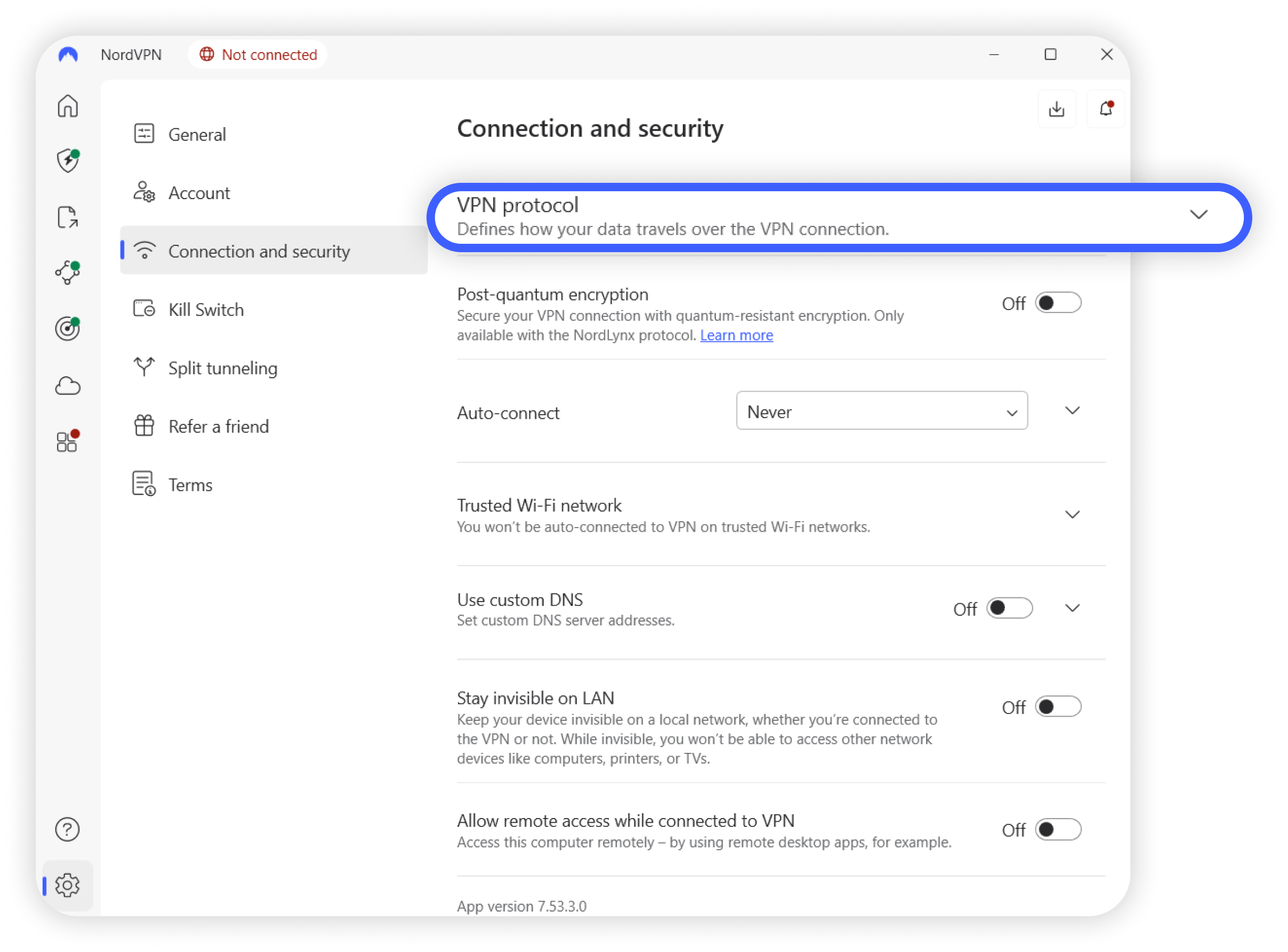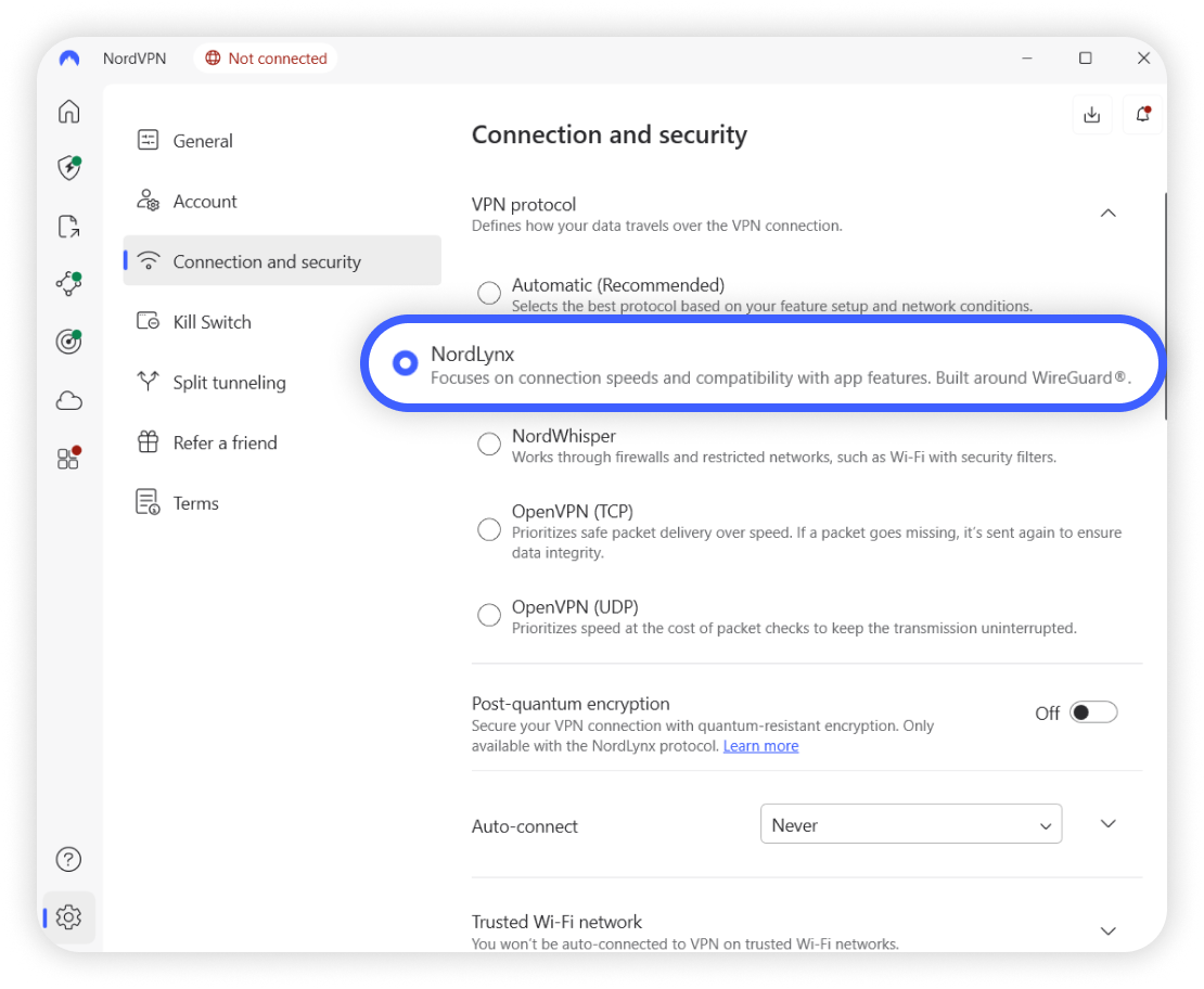 - Select Auto-connect on the left side of the menu and disable the Choose a VPN protocol and server automatically option. Afterward, click on the VPN protocol drop-down menu and select NordLynx.