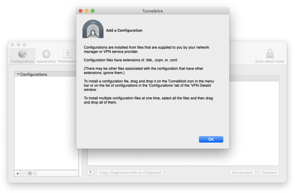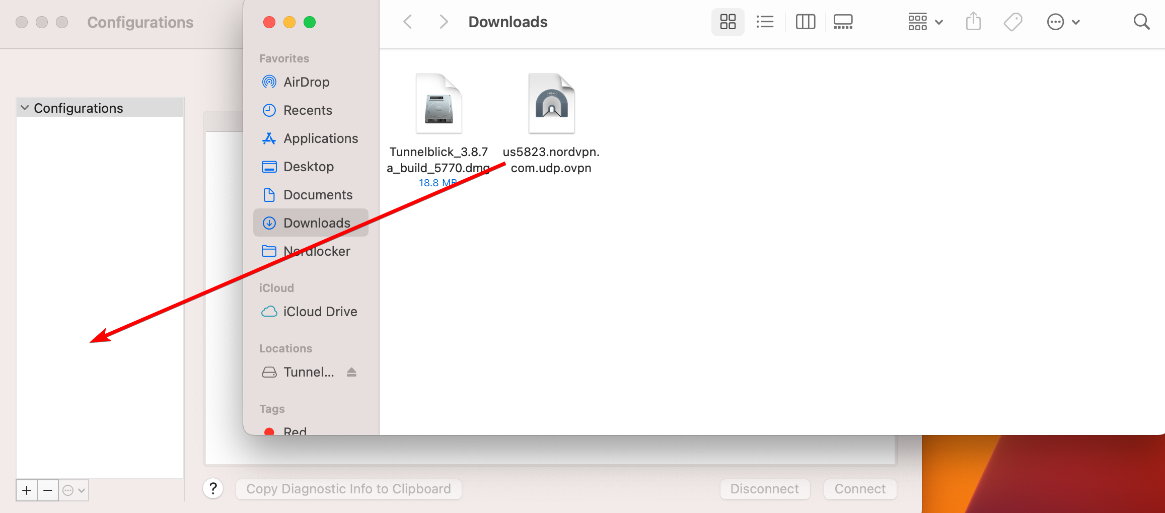 - Drag and drop the previously downloaded .ovpn file from your Downloads folder to the Configurations tab in Tunnelblick.