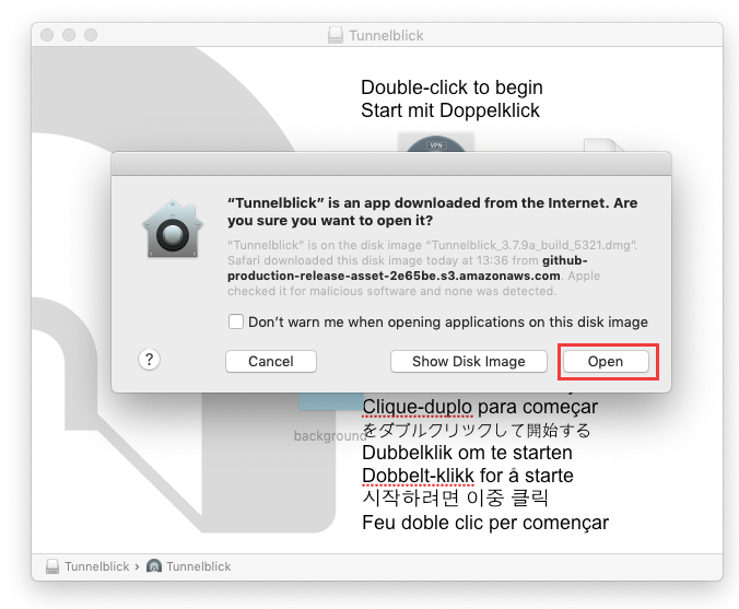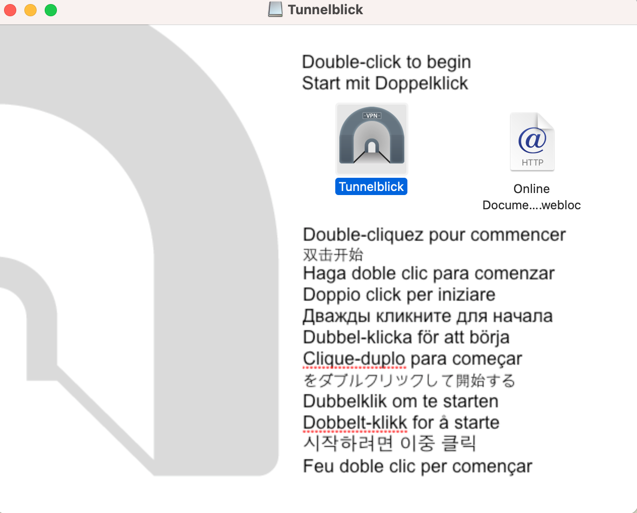 - Navigate to your Downloads folder and double-click the Tunnelblick installation file you have just downloaded (it has a .dmg extension).