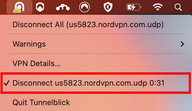 - That’s it! You are now connected to a VPN. To disconnect, click on the Tunnelblick icon in your status bar and select Disconnect in the drop-down menu.